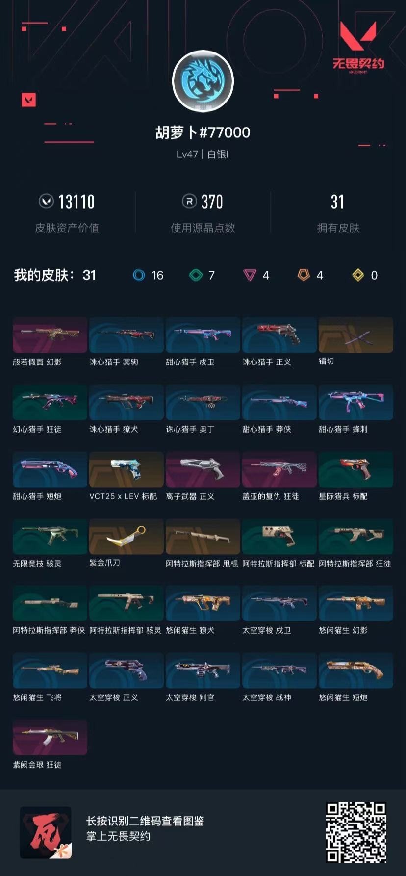 [14407261]4橙皮 4紫皮 31皮肤 17英雄 50卡面 370已用源晶 白银段位 【近战武器皮肤】:镭切阿特拉斯指挥部紫金爪刀 【佩呛皮肤】:标配-vct25xlev正义-离子武器 【步呛皮肤】:狂徒-紫阙金琅狂徒-盖亚的复仇幻影-般若假面 【挂饰】:vctxlev挂饰