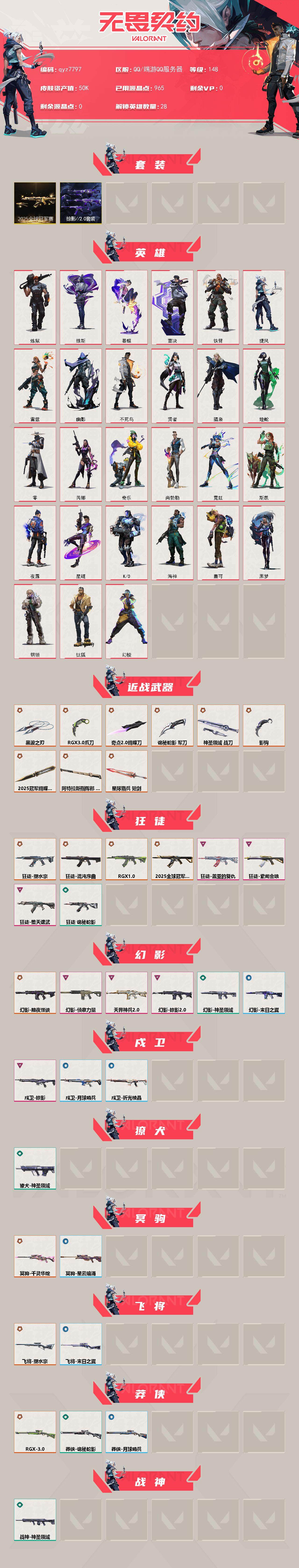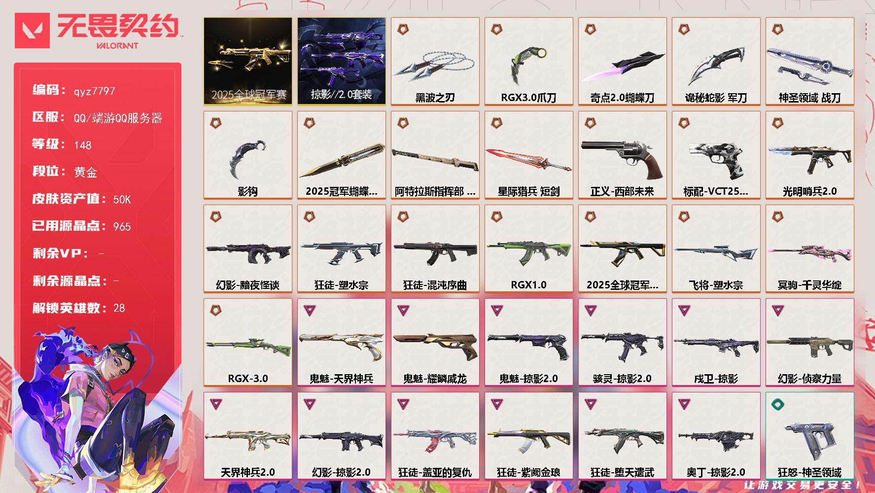 【qyz7797】精品黄金号-低价捡漏出-喜欢的来吧-qyz7797-套装:-掠影20套装-近战武器皮肤:-黑波之刃爪刀-rgx-11z-pro-30蝴蝶刀-奇点//20神圣领域-战刀诡秘蛇影影钩-步呛皮肤:-狂徒-紫阙金琅狂徒-盖亚的复仇幻影-侦察力量狂徒-塑水宗狂徒-堕天遗武幻影-天界神兵20狂徒-混沌序曲幻影-黯夜怪谈戍卫-掠影狂徒-rgx-11z-pro幻影-掠影20-佩呛皮肤:-鬼魅-天界神兵鬼魅-耀鳞威龙标配-vct25xts正义-西部未来鬼魅-掠影20-狙击呛皮肤:-飞将-塑水宗冥驹-千灵华绽莽侠-rgx-11z-pro-30-冲锋呛皮肤:-骇灵-光明哨兵20骇灵-掠影20-机呛皮肤:-奥丁-掠影20-亮点:-【qyz7797】【套装】:2025全球冠军赛套装,掠影//20套装【英雄】:幻棱,炼狱,维斯,暮蝶,钛狐,壹决,铁臂,捷风,雷兹,幽影,不死鸟,贤者,猎枭,蝰蛇,零,芮娜,奇乐,尚勃勒,霓虹,斯凯,夜露,星礈,k/o,海神,盖可,黑梦,钢锁【近战-武器】:近战武器-2025全球冠军赛-蝴蝶刀,近战武器-影钩,近战武器-奇点//20-蝴蝶刀,近战武器-rgx-11z-pro//30-爪刀,近战武器-黑波之刃,近战武器-诡秘蛇影-军刀,近战武器-神圣领域-战刀,近战武器-阿特拉斯指挥部-甩棍,近战武器-星际猎兵-短剑【狂徒】:狂徒-2025全球冠军赛,狂徒-混沌序曲,狂徒-塑水宗,狂徒-rgx-11z-pro,狂徒-堕天遗武,狂徒-盖亚的复仇,狂徒-紫阙金琅,狂徒-诡秘蛇影【幻影】:幻影-黯夜怪谈,幻影-天界神兵//20,幻影-侦察力量,幻影-掠影//20,幻影-神圣领域,幻影-末日之翼【戍卫】:戍卫-掠影,戍卫-月球哨兵,戍卫-折光棱晶【獠犬】:獠犬-神圣领域【冥驹】:冥驹-千灵华绽,冥驹-星云暗涌【飞将】:飞将-塑水宗,飞将-末日之翼【莽侠】:莽侠-rgx-11z-pro//30,莽侠-诡秘蛇影,莽侠-月球哨兵【战神】:战神-神圣领域【奥丁】:奥丁-掠影//20,奥丁-末日之翼【判官】:判官-诡秘蛇影【雄鹿】:雄鹿-月球哨兵【骇灵】:骇灵-光明哨兵//20,骇灵-掠影//20,骇灵-星云暗涌【蜂刺】:蜂刺-星云暗涌,蜂刺-折光棱晶【标配】:标配-折光棱晶【vct
