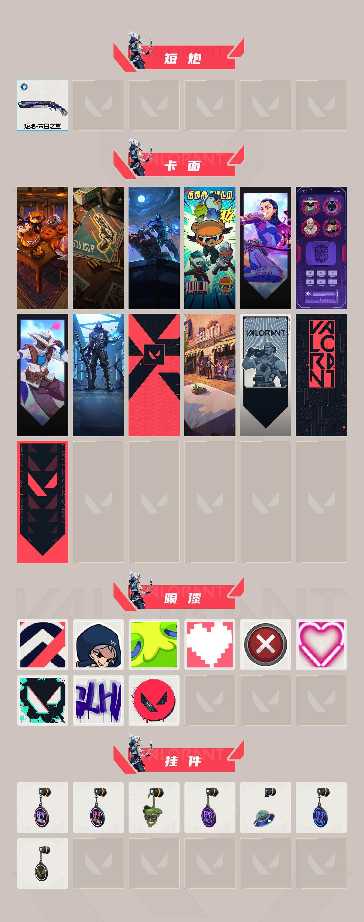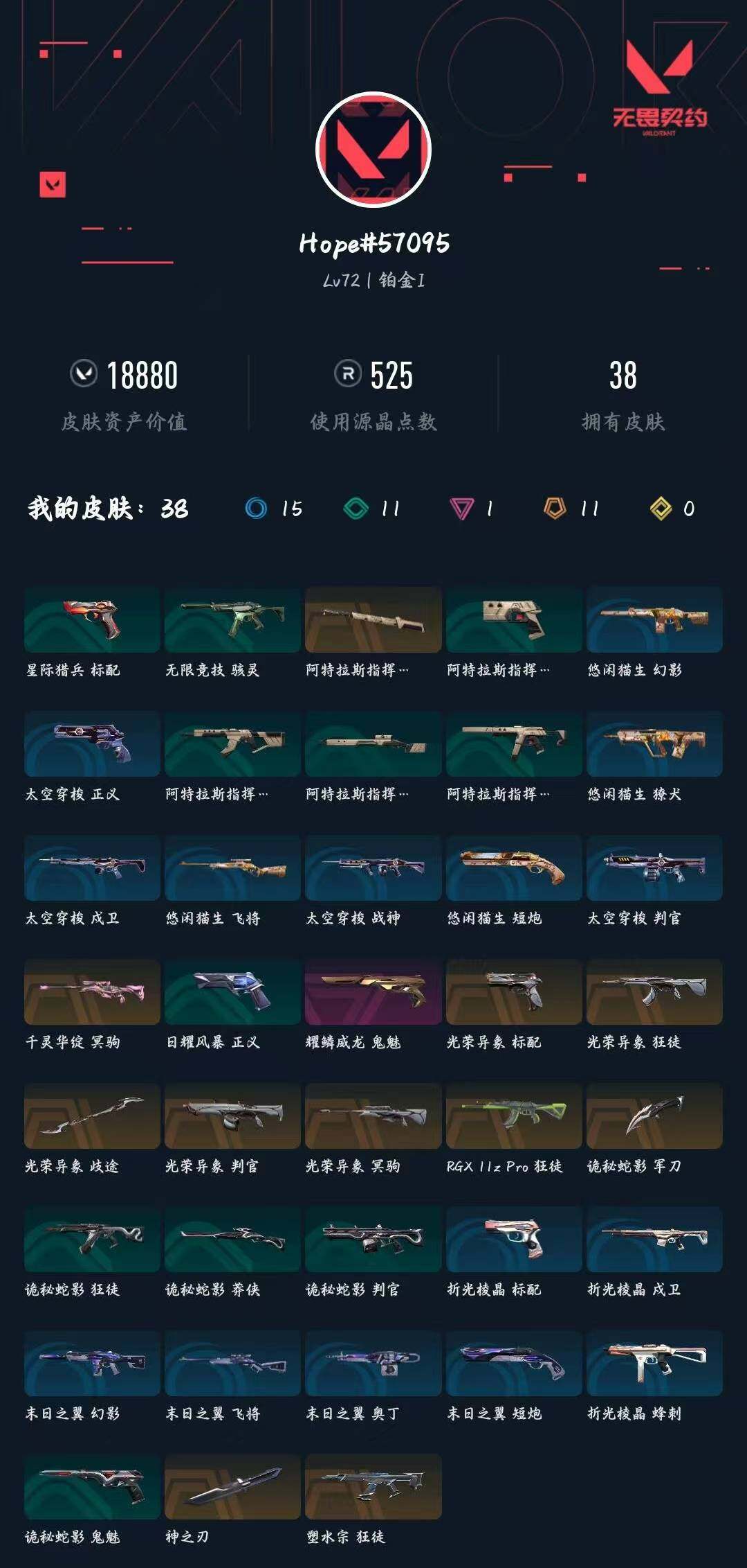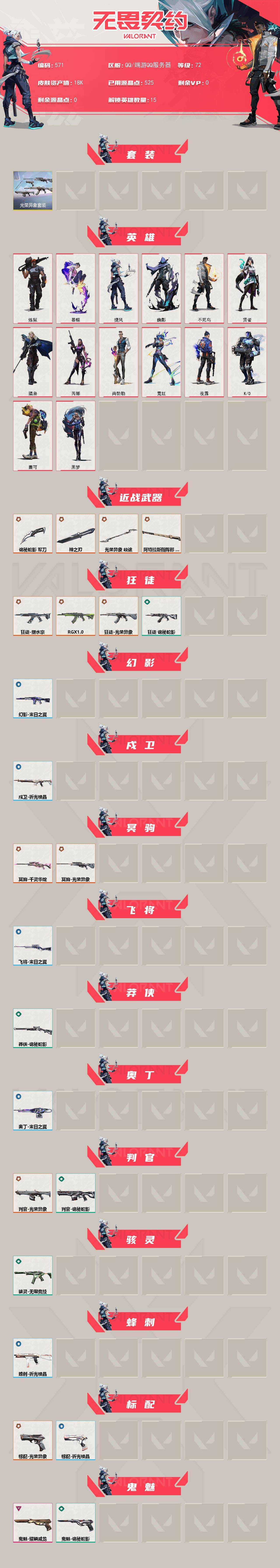 [14407840]【套装】:光荣异象套装 【英雄】:炼狱,暮蝶,捷风,幽影,不死鸟,贤者,猎枭,芮娜,尚勃勒,霓虹,夜露,k/o,盖可,黑梦 【近战 武器】:近战武器-光荣异象 歧途,近战武器-神之刃,近战武器-诡秘蛇影 军刀,近战武器-阿特拉斯指挥部 甩棍 【狂徒】:狂徒-塑水宗,狂徒-rgx 11z pro,狂徒-光荣异象,狂徒-诡秘蛇影 【幻影】:幻影-末日之翼 【戍卫】:戍卫-折光棱晶 【冥驹】:冥驹-千灵华绽,冥驹-光荣异象 【飞将】:飞将-末日之翼 【莽侠】:莽侠-诡秘蛇影 【奥丁】:奥丁-末日之翼 【判官】:判官-光荣异象,判官-诡秘蛇影 【骇灵】:骇灵-无限竞技 【蜂刺】:蜂刺-折光棱晶 【标配】:标配-光荣异象,标配-折光棱晶 【鬼魅】:鬼魅-耀鳞威龙,鬼魅-诡秘蛇影 【短炮】:短炮-末日之翼 【卡面】:南瓜盛典 卡面,正义的化身 卡面,失控边缘 卡面,战术熊与伙伴们 卡面,无畏契约go!第一卷:芮娜 卡面,清除名单 卡面,无畏契约go!第一卷:零 卡面,暗呛 卡面,代号红色 卡面,冰淇淋店 卡面,新兵报到 卡面,v契约 卡面,无畏契约 卡面 【喷漆】:控场勿近 喷漆,捷风差距 喷漆,uwu 喷漆,双击点赞 喷漆,买装还是存钱 喷漆,蕊形灯 喷漆,胜利属于无畏契约 喷漆,glhf 喷漆,无畏契约 喷漆 【挂饰】:第九季//第三幕 纪念币 挂饰,第九季//第二幕 纪念币 挂饰,战术河童 挂饰,第八季//第二幕 纪念币 挂饰 ,天外飞客 挂饰,第八季//第一幕 纪念币 挂饰,无畏契约 纪念币 挂饰