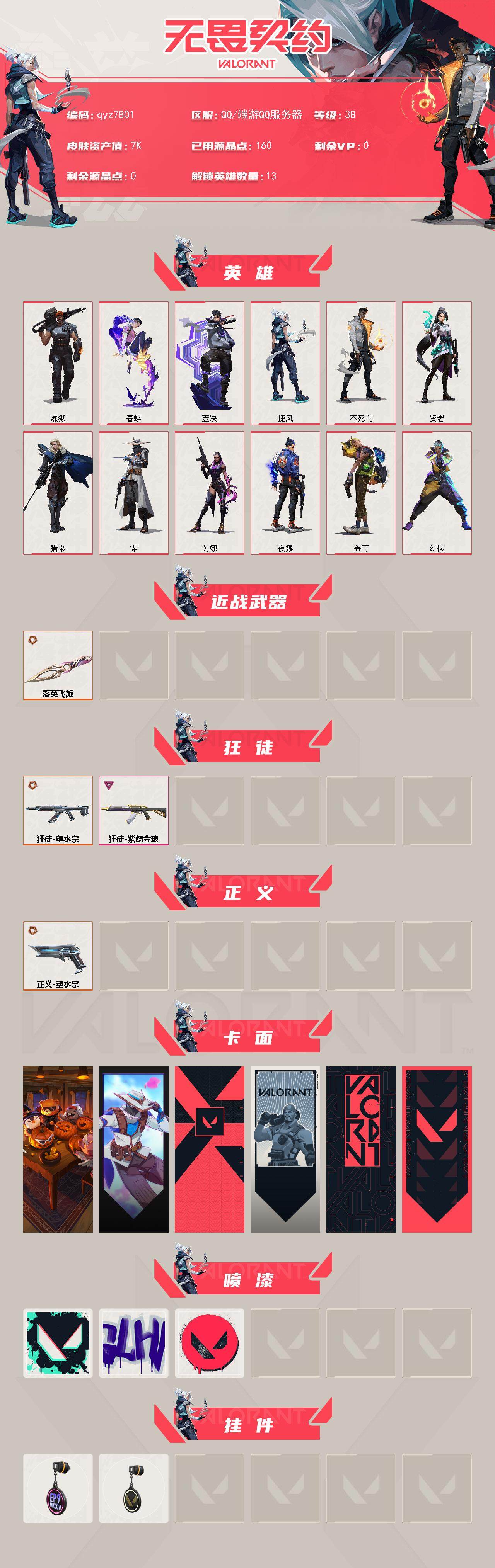 青铜-精品组合号-塑水宗-狂徒-紫阙金琅-狂徒-落英飞旋-塑水宗-正义-qyz7801-近战武器皮肤:-落英飞旋-步呛皮肤:-狂徒-紫阙金琅狂徒-塑水宗-佩呛皮肤:-正义-塑水宗-亮点:-【qyz7801】【英雄】:幻棱,炼狱,暮蝶,壹决,捷风,不死鸟,贤者,猎枭,零,芮娜,夜露,盖可【近战-武器】:近战武器-落英飞旋【狂徒】:狂徒-塑水宗,狂徒-紫阙金琅【正义】:正义-塑水宗【卡面】:南瓜盛典-卡面,无畏契约go!第一卷:零-卡面,代号红色-卡面,新兵报到-卡面,v契约-卡面,无畏契约-卡面【喷漆】:胜利属于无畏契约-喷漆,glhf-喷漆,无畏契约-喷漆【挂饰】:第九季//第三幕-纪念币-挂饰,无畏契约-纪念币-挂饰