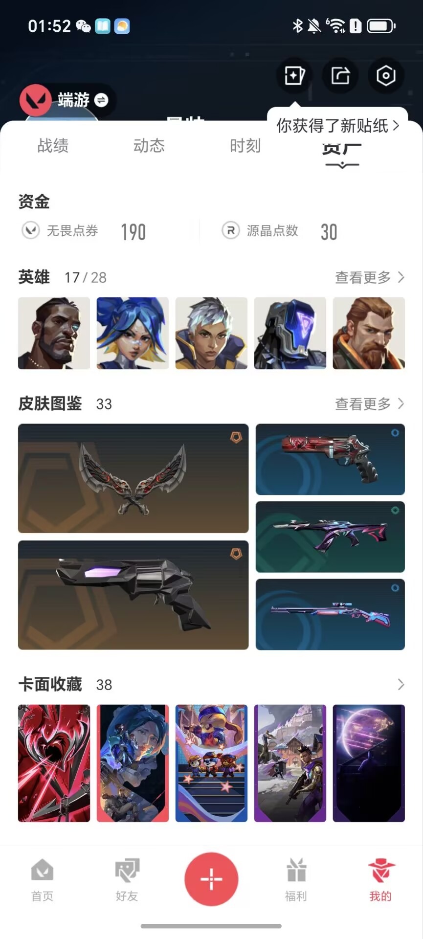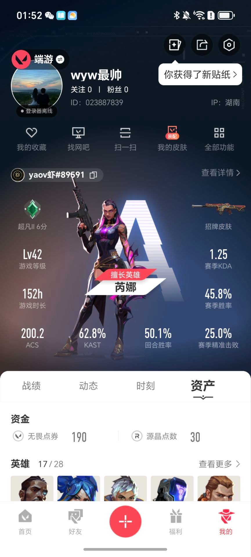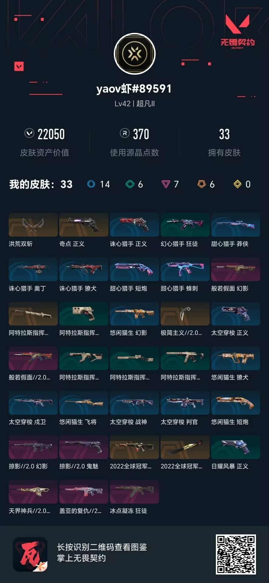 6橙皮 7紫皮 33皮肤 17英雄 38卡面 370已用源晶 超凡段位 【亮点皮肤】:幻影-2022全球冠军赛蝴蝶刀-2022全球冠军赛 【套装】:2022全球冠军赛 【近战武器皮肤】:极简主义2.0 爪刀阿特拉斯指挥部洪荒双斩 【佩呛皮肤】:鬼魅-掠影2.0正义-奇点 【步呛皮肤】:狂徒