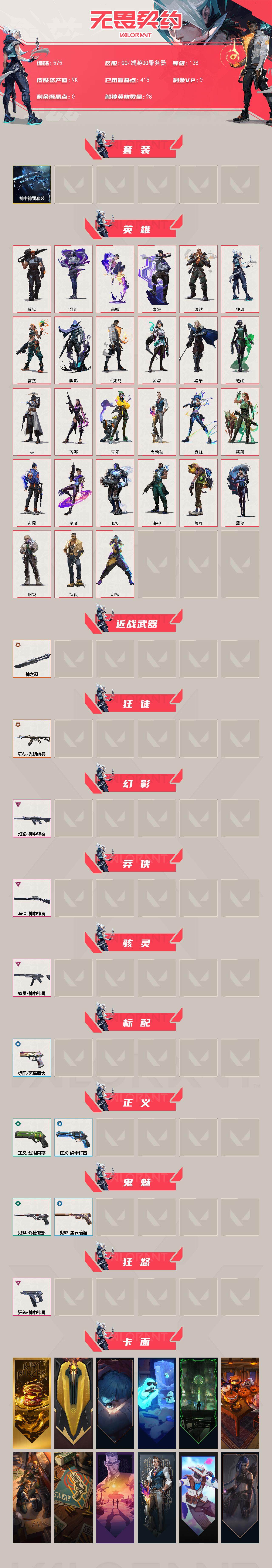 [14408493]【套装】:神中神罚套装 【英雄】:幻棱,炼狱,维斯,暮蝶,钛狐,壹决,铁臂,捷风,雷兹,幽影,不死鸟,贤者,猎枭,蝰蛇,零,芮娜,奇乐,尚勃勒,霓虹,斯凯,夜露,星礈,k/o,海神,盖可,黑梦,钢锁 【近战 武器】:近战武器-神之刃 【狂徒】:狂徒-光明哨兵 【幻影】:幻影-神中神罚 【莽侠】:莽侠-神中神罚 【骇灵】:骇灵-神中神罚 【标配】:标配-艺高胆大 【正义】:正义-超限闪存,正义-纳米打击 【鬼魅】:鬼魅-诡秘蛇影,鬼魅-星云暗涌 【狂怒】:狂怒-神中神罚 【卡面】:终章:激斗汉堡 卡面,进入射程 卡面,《双城之战》拥抱 卡面,精灵大战 卡面,欢迎来到底城 卡面,南瓜盛典 卡面,修车达人 卡面,正义的化身 卡面,风险合作 卡面,无畏契约:尚勃勒 卡面,无畏契约go!第一卷:零 卡面,《双城之战》金克丝 卡面,代号红色 卡面,冰淇淋店 卡面,新兵报到 卡面,v契约 卡面,无畏契约 卡面 【喷漆】:嗨宝南瓜灯 喷漆,嘭! 喷漆,都算到了 喷漆,控场勿近 喷漆,小丑猫 喷漆,熊抱 喷漆,尚勃勒 喷漆,分身有术 喷漆,致命优雅 喷漆,霓光四射 喷漆,买装还是存钱 喷漆,关门放狗 喷漆,胜利属于无畏契约 喷漆,glhf 喷漆,无畏契约 喷漆 【挂饰】:终章:猫猫木乃伊 挂饰,悠闲鸡块 挂饰,伞绳 挂饰,《双城之战》小蛋糕 挂饰,第九季//第三幕 纪念币 挂饰,工具腰带 挂饰,无畏契约go!第一卷 零 挂饰,熔岩灯 挂饰,第九季//第二幕 纪念币 挂饰,有事联系 挂饰,天外飞客 挂饰,无畏契约 纪念币 挂饰