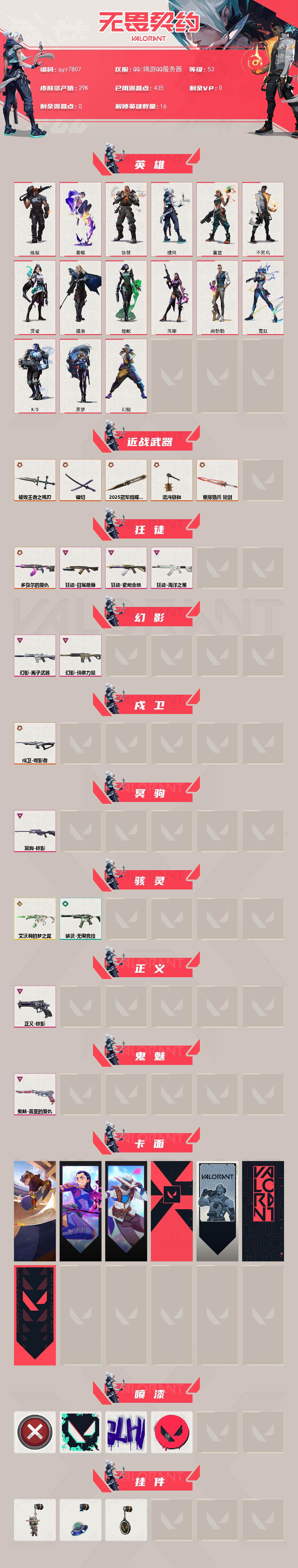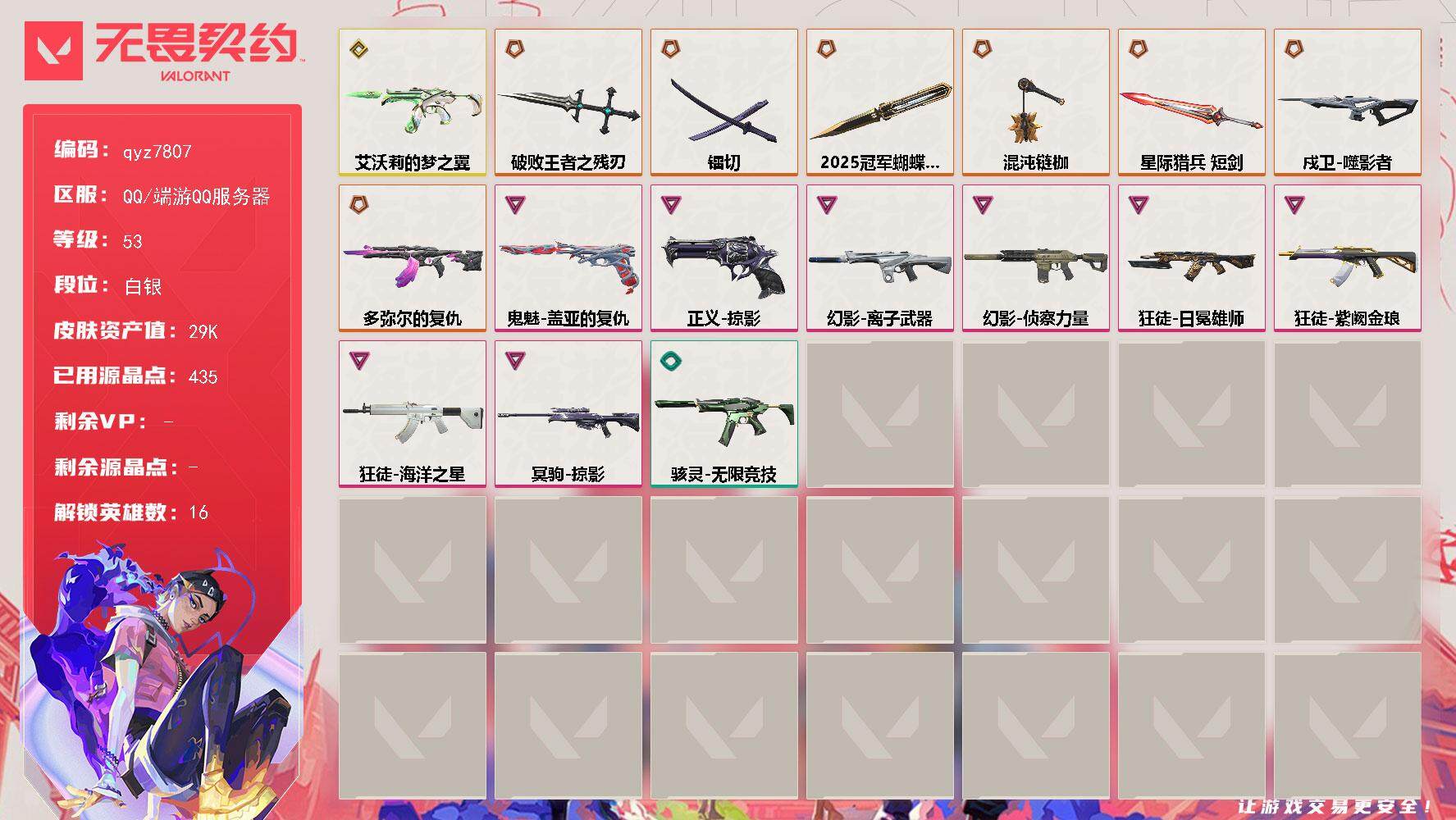 25蝴蝶-镭切-紫金ak-qyz7807-近战武器皮肤:-破败王者之残刃镭切2025全球冠军赛-蝴蝶刀-步呛皮肤:-狂徒-紫阙金琅幻影-侦察力量狂徒-海洋之星幻影-离子武器狂徒-日冕雄师戍卫-噬影者-佩呛皮肤:-鬼魅-盖亚的复仇正义-掠影-狙击呛皮肤:-冥驹-掠影-冲锋呛皮肤:-骇灵-艾沃莉的梦之翼-亮点:-【qyz7807】【英雄】:幻棱,炼狱,暮蝶,铁臂,捷风,雷兹,不死鸟,贤者,猎枭,蝰蛇,芮娜,尚勃勒,霓虹,k/o,黑梦【近战-武器】:近战武器-2025全球冠军赛-蝴蝶刀,近战武器-混沌链枷,近战武器-镭切,近战武器-破败王者之残刃,近战武器-星际猎兵-短剑【狂徒】:狂徒-多弥尔的复仇,狂徒-海洋之星,狂徒-日冕雄师,狂徒-紫阙金琅【幻影】:幻影-离子武器,幻影-侦察力量【戍卫】:戍卫-噬影者【冥驹】:冥驹-掠影【骇灵】:骇灵-艾沃莉的梦之翼,骇灵-无限竞技【正义】:正义-掠影【鬼魅】:鬼魅-盖亚的复仇【卡面】:clutch-卡面,无畏契约go!第一卷:芮娜-卡面,无畏契约go!第一卷:零-卡面,代号红色-卡面,新兵报到-卡面,v契约-卡面,无畏契约-卡面【喷漆】:买装还是存钱-喷漆,胜利属于无畏契约-喷漆,glhf-喷漆,无畏契约-喷漆【挂饰】:无畏契约go!第一卷-零-挂饰,天外飞客-挂饰,无畏契约-纪念币-挂饰