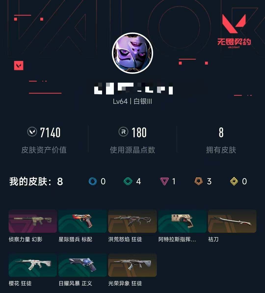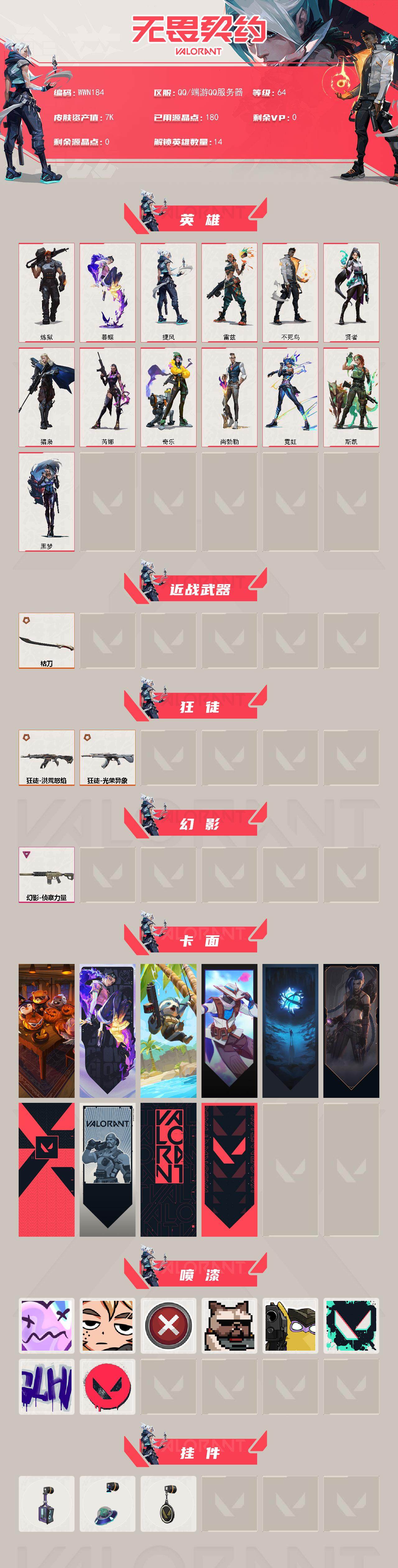 【wwn184】终极3/卓越1/皮肤8/等级64/段位:白银/炼狱/暮蝶/捷风/雷兹/不死鸟/贤者/猎枭/芮娜/奇乐/尚勃勒/霓虹/斯凯/黑梦/近战武器-祜刀/狂徒-洪荒怒焰/狂徒-光荣异象/幻影-侦察力量/南瓜盛典 卡面/无畏契约:暮蝶 卡面/树懒大作战 卡面/无畏契约go!第一卷:零 卡面/无垠星环 卡面/《双城之战》金克丝 卡面/代号红色 卡面/新兵报到 卡面/v契约 卡面/无畏契约 卡面/伤心心 喷漆/不予置评 喷漆/买装还是存钱 喷漆/关门放狗 喷漆/放下武器 喷漆/胜利属于无畏契约 喷漆/glhf 喷漆/无畏契约 喷漆/动力机箱 挂饰/天外飞客 挂饰/无畏契约 纪念币 挂饰