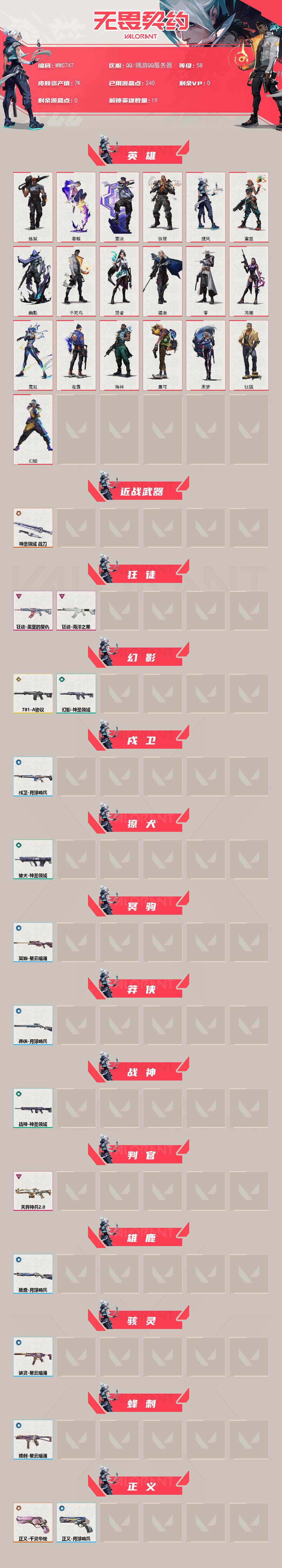 【wwc747】终极2/传奇1/卓越3/皮肤20/等级58/段位:青铜/幻棱/炼狱/暮蝶/钛狐/壹决/铁臂/捷风/雷兹/幽影/不死鸟/贤者/猎枭/零/芮娜/霓虹/夜露/海神/盖可/黑梦/近战武器-神圣领域 战刀/狂徒-盖亚的复仇/狂徒-海洋之星/幻影-781-a协议/幻影-神圣领域/戍卫-月球哨兵/獠犬-神圣领域/冥驹-星云暗涌/莽侠-月球哨兵/战神-神圣领域/判官-天界神兵//2.0/雄鹿-月球哨兵/骇灵-星云暗涌/蜂刺-星云暗涌/正义-千灵华绽/正义-月球哨兵/鬼魅-诡秘蛇影/鬼魅-星云暗涌/狂怒-神圣领域/精灵大战 卡面/南瓜盛典 卡面/无畏契约go!第一卷:芮娜 卡面/无畏契约go!第一卷:零 卡面/代号红色 卡面/新兵报到 卡面/v契约 卡面/无畏契约 卡面/嗨宝南瓜灯 喷漆/控场勿近 喷漆/买装还是存钱 喷漆/胜利属于无畏契约 喷漆/glhf 喷漆/无畏契约 喷漆/悠闲鸡块 挂饰/伞绳 挂饰/第九季//第三幕 纪念币 挂饰/天外飞客 挂饰/无畏契约 纪念币 挂饰