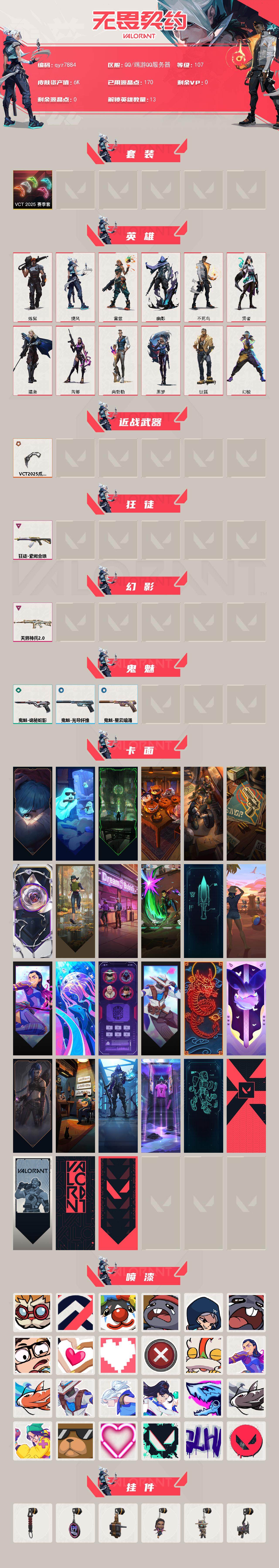 vct-2025-爪刀-紫阙金琅-狂徒-天界神兵//20-幻影-qyz7884-lv107-超凡i,-刀皮数量1,呛皮数量7-绝版1限定1终极0卓越2-;皮肤资产价值6360,已用r点170;【刀皮】:近战武器-vct2025爪刀;-【呛皮】:狂徒-紫阙金琅,幻影-天界神兵20,标配-星际猎兵,鬼魅-诡秘蛇影,鬼魅-光导纤维,正义-日耀风暴,鬼魅-星云暗涌;【热门卡面】:布鲁诺中校卡面,vct2025cn联赛卡面,vct2025太平洋联赛卡面,vct2025美洲联赛卡面,vct2025emea联赛卡面,双城之战拥抱卡面,狼人猎手卡面,双城之战金克丝卡面;【热门挂饰】:永生玫瑰挂饰,神中神挂饰,vct2025cn联赛挂饰,vct2025太平洋联赛挂饰,vct2025emea联赛挂饰,vct2025美洲联赛挂饰,鱼骨头挂饰,双城之战魄罗挂饰;【热门喷漆】:进击的章鱼2喷漆,双人比心喷漆,小丑猫喷漆,买装还是存钱喷漆,无条件投降喷漆,双击点赞喷漆,比心喷漆,醒狮贺春喷漆;详情看图【皮肤可能含有某些特权皮肤,具体以游戏内实际拥有为准】