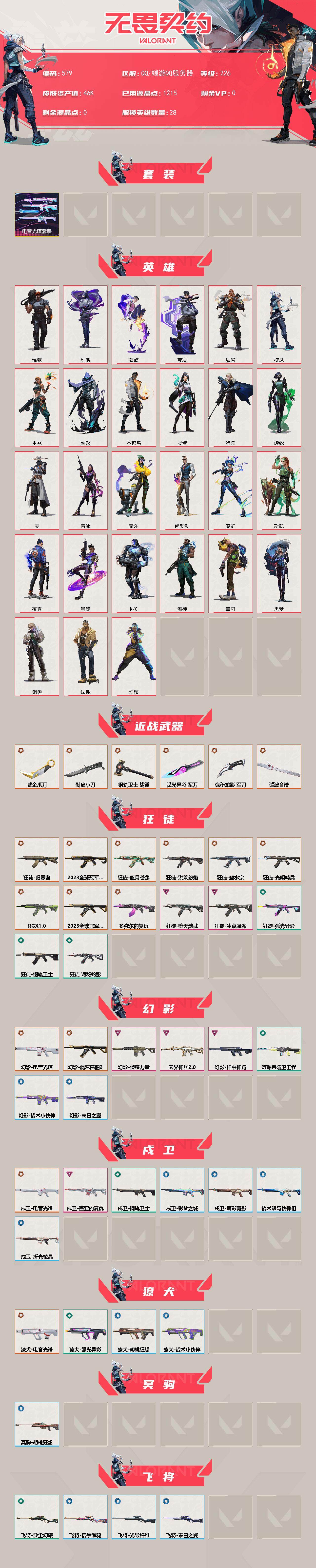 [14414722]【套装】:电音光谱套装 【英雄】:幻棱,炼狱,维斯,暮蝶,钛狐,壹决,铁臂,捷风,雷兹,幽影,不死鸟,贤者,猎枭,蝰蛇,零,芮娜,奇乐,尚勃勒,霓虹,斯凯,夜露,星礈,k/o,海神,盖可,黑梦,钢锁 【近战 武器】:近战武器-谐波音谱,近战武器-剥皮小刀,近战武器-紫金爪刀,近战武器-钢轨卫士 战锤,近战武器-弧光异彩 军刀,近战武器-诡秘蛇影 军刀 【狂徒】:狂徒-2025全球冠军赛,狂徒-2023全球冠军赛,狂徒-光明哨兵,狂徒-归零者,狂徒-洪荒怒焰,狂徒-塑水宗,狂徒-偃月苍龙,狂徒-rgx 11z pro,狂徒-多弥尔的复仇,狂徒-冰点凝冻,狂徒-堕天遗武,狂徒-钢轨卫士,狂徒-弧光异彩,狂徒-诡秘蛇影 【幻影】:幻影-电音光谱,幻影-混沌序曲//2.0,幻影-天界神兵//2.0,幻影-侦察力量,幻影-神中神罚,幻影-噬源兽防卫工程,幻影-战术小伙伴,幻影-末日之翼,幻影-电音光谱 【戍卫】:戍卫-电音光谱,戍卫-盖亚的复仇,戍卫-钢轨卫士,戍卫-彩梦之城,戍卫-萌彩剪影,戍卫-战术熊与伙伴们,戍卫-折光棱晶,戍卫-电音光谱 【獠犬】:獠犬-电音光谱,獠犬-弧光异彩,獠犬-胡桃狂想,獠犬-战术小伙伴,獠犬-电音光谱 【冥驹】:冥驹-胡桃狂想 【飞将】:飞将-沙尘幻旅,飞将-信手涂鸦,飞将-光导纤维,飞将-末日之翼 【莽侠】:莽侠-诡秘蛇影 【战神】:战神-萌彩剪影 【奥丁】:奥丁-信手涂鸦,奥丁-战术小伙伴,奥丁-末日之翼 【判官】:判官-诡秘蛇影,判官-萌彩剪影 【雄鹿】:雄鹿-彩梦之城 【骇灵】:骇灵-流星兵团,骇灵-沙尘幻旅,骇灵-光导纤维,骇灵-信手涂鸦 【蜂刺】:蜂刺-弧光异彩,蜂刺-胡桃狂想,蜂刺-纤云弄巧,蜂刺-战术小伙伴,蜂刺-折光棱晶 【标配】:标配-电音光谱,标配-彩梦之城,标配-光导纤维,标配-战术熊与伙伴们,标配-折光棱晶,标配-电音光谱 【正义】:正义-光明哨兵,正义-混沌序曲//2.0,正义-离子武器,正义-超限闪存,正义-传奇制造,正义-复古浪潮 【鬼魅】:鬼魅-奇幻朋克,鬼魅-诡秘蛇影,鬼魅-光导纤维,鬼魅-胡桃狂想,鬼魅-数码咒术,鬼魅-信手涂鸦 【狂怒】:狂怒-钢轨卫士,狂怒-萌彩剪影,狂怒-战术熊与伙伴们 【短炮】:短炮-钢轨卫士,短炮-弧光异彩,短炮-纤云弄巧,短炮-末日之翼 【卡面】:精灵大战 卡面,欢迎来到底城