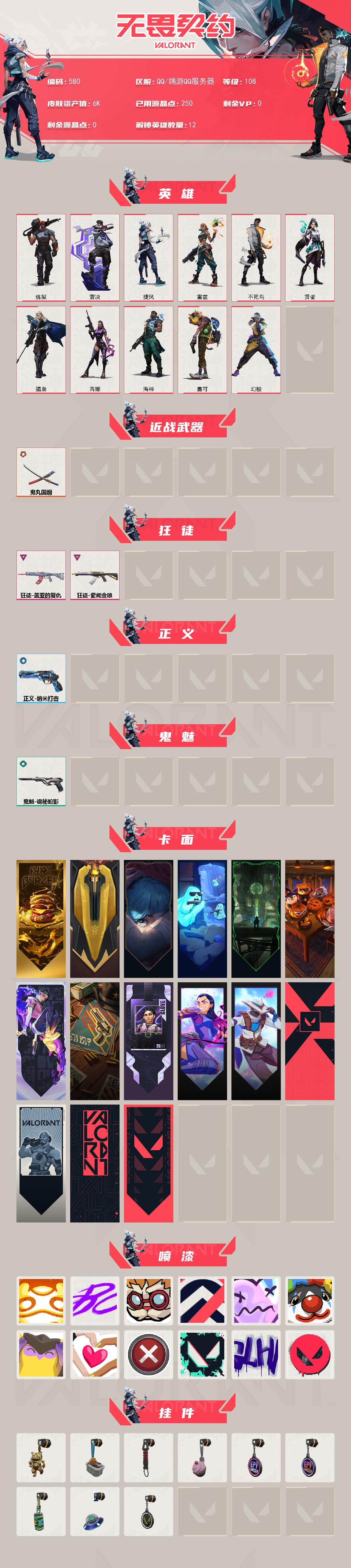 [14414850]【英雄】:幻棱,炼狱,壹决,捷风,雷兹,不死鸟,贤者,猎枭,芮娜,海神,盖可 【近战 武器】:近战武器-鬼丸国纲 【狂徒】:狂徒-盖亚的复仇,狂徒-紫阙金琅 【正义】:正义-纳米打击 【鬼魅】:鬼魅-诡秘蛇影 【卡面】:终章:激斗汉堡 卡面,进入射程 卡面,《双城之战》拥抱 卡面,精灵大战 卡面,欢迎来到底城 卡面,南瓜盛典 卡面,无畏契约:暮蝶 卡面,正义的化身 卡面,暮蝶工牌 卡面,无畏契约go!第一卷:芮娜 卡面,无畏契约go!第一卷:零 卡面,代号红色 卡面,新兵报到 卡面,v契约 卡面,无畏契约 卡面 【喷漆】:嗨宝南瓜灯 喷漆,嘭! 喷漆,都算到了 喷漆,控场勿近 喷漆,伤心心 喷漆,小丑猫 喷漆,皮蛋萌舞 喷漆,双人比心 喷漆,买装还是存钱 喷漆,胜利属于无畏契约 喷漆,glhf 喷漆,无畏契约 喷漆 【挂饰】:终章:猫猫木乃伊 挂饰,悠闲鸡块 挂饰,伞绳 挂饰,《双城之战》小蛋糕 挂饰,第九季//第三幕 纪念币 挂饰,第九季//第二幕 纪念币 挂饰,z世代特饮 挂饰,天外飞客 挂饰,无畏契约 纪念币 挂饰
