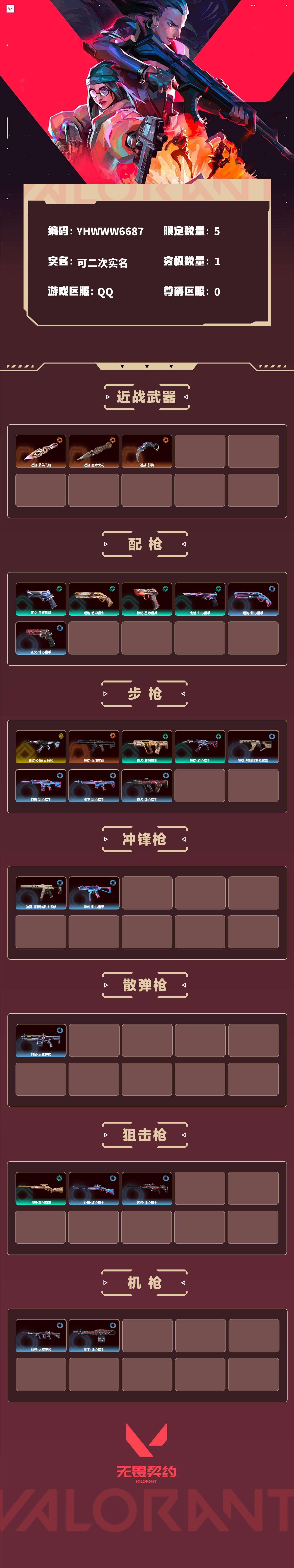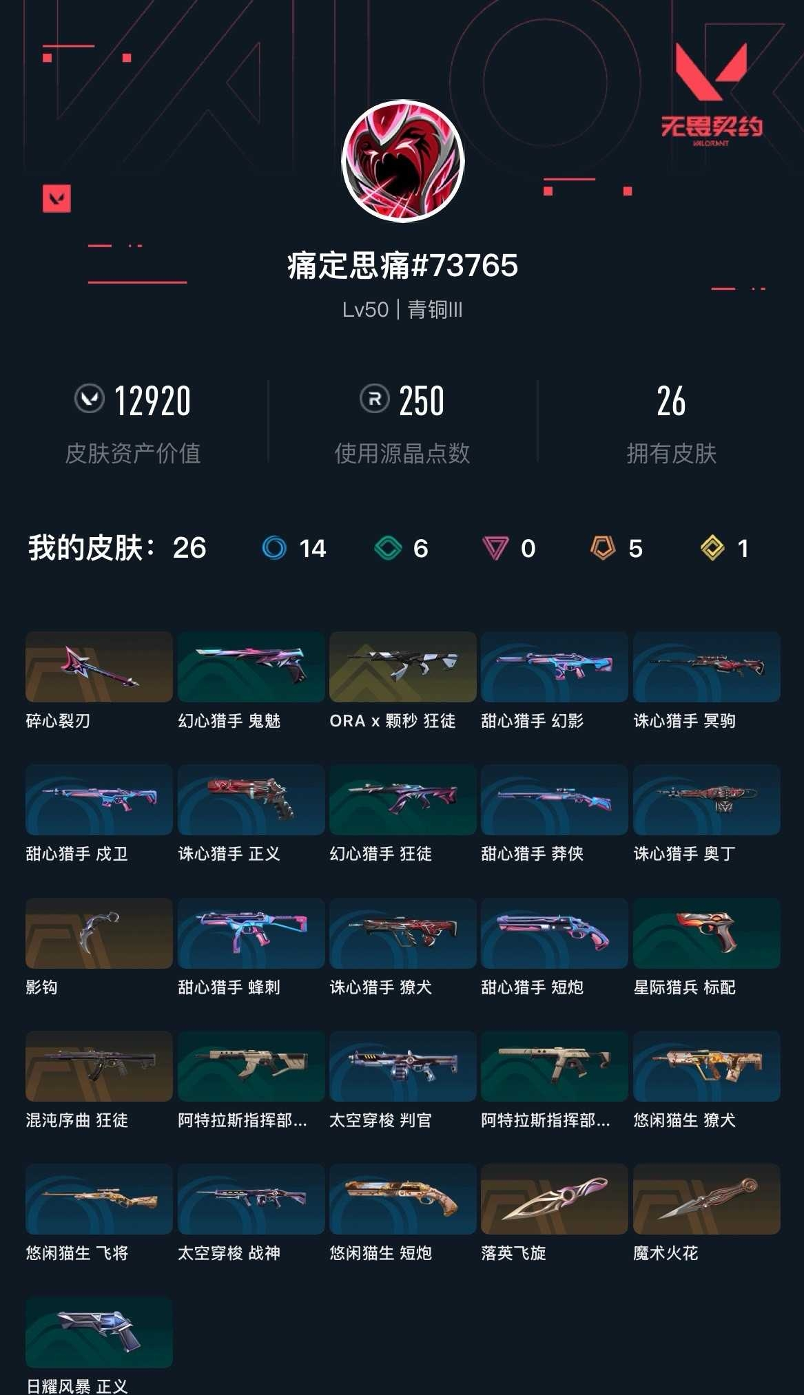 【无畏契约】【yhwww6687】等级:51,已用无畏点12920,已用源晶点265,橙皮:近战-落英飞旋|狂徒-混沌序曲|近战-魔术火花|近战-影钩__段位:白银__绿皮:正义-日耀风暴|短炮-悠闲猫生|飞将-悠闲猫生|獠犬-悠闲猫生|标配-星际猎兵|狂徒-幻心猎手|鬼魅-幻心猎手__蓝皮:战神-太空穿梭|判官-太空穿梭|骇灵-阿特拉斯指挥部|狂徒-阿特拉斯指挥部|蜂刺-甜心猎手|短炮-甜心猎手|莽侠-甜心猎手|幻影-甜心猎手|戍卫-甜心猎手|正义-诛心猎手|冥驹-诛心猎手|獠犬-诛心猎手|奥丁-诛心猎手__英雄:黑梦|暮蝶|炼狱|贤者|猎枭|芮娜|捷风|不死鸟|禁灭__金皮:狂徒-a x 颗秒
