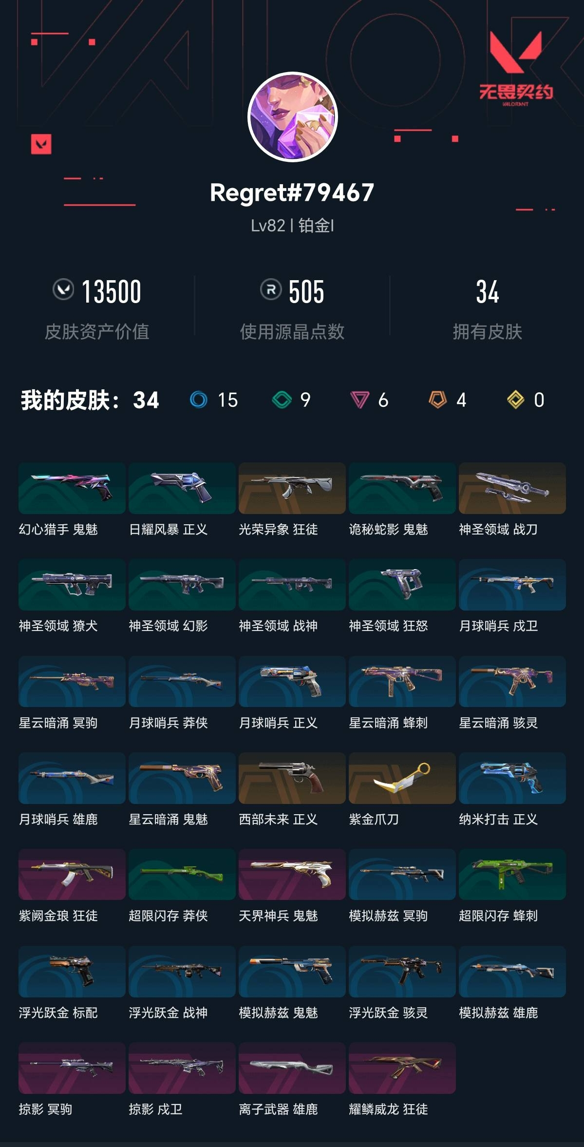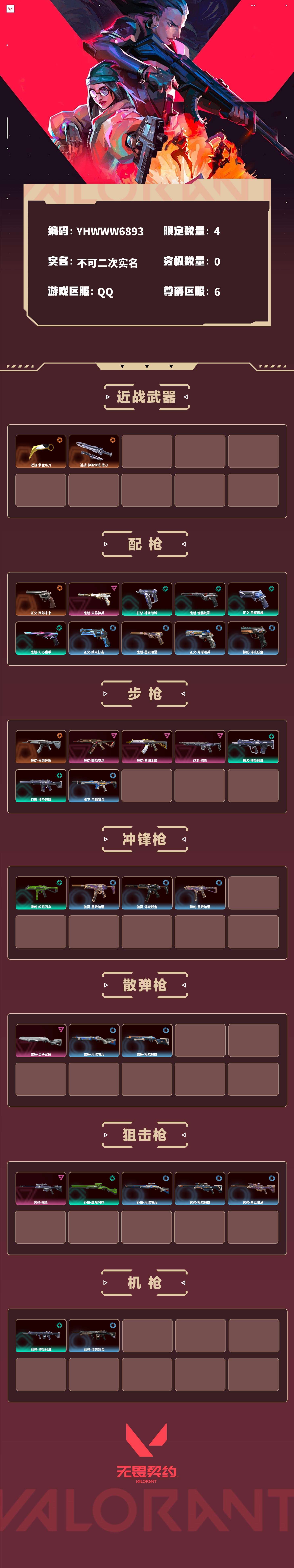 【无畏契约】【yhwww6893】等级:82,已用无畏点13500,已用源晶点505,橙皮:近战-紫金爪刀|近战-神圣领域 战刀|正义-西部未来|狂徒-光荣异象__紫皮:鬼魅-天界神兵|狂徒-耀鳞威龙|狂徒-紫阙金琅|雄鹿-离子武器|冥驹-掠影|戍卫-掠影__段位:铂金__蓝皮:正义-纳米打击|鬼魅-星云暗涌|骇灵-星云暗涌|正义-月球哨兵|莽侠-月球哨兵|戍卫-月球哨兵|雄鹿-月球哨兵|骇灵-浮光跃金|标配-浮光跃金|战神-浮光跃金|鬼魅-模拟赫兹|冥驹-模拟赫兹|雄鹿-模拟赫兹|冥驹-星云暗涌|蜂刺-星云暗涌__绿皮:獠犬-神圣领域|狂怒-神圣领域|战神-神圣领域|幻影-神圣领域|莽侠-超限闪存|蜂刺-超限闪存|鬼魅-诡秘蛇影|正义-日耀风暴|鬼魅-幻心猎手__英雄:尚勃勒|黑梦|斯凯|暮蝶|盖可|霓虹|壹决|星礈|幽影|夜露|钢锁|奇乐|炼狱|铁臂|贤者|猎枭|钛狐|芮娜|零|捷风|蝰蛇|不死鸟|幻棱|禁灭