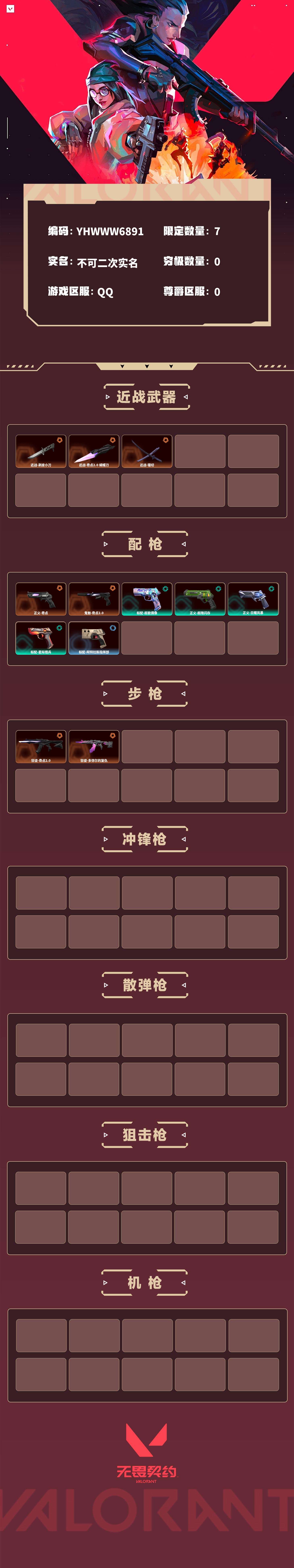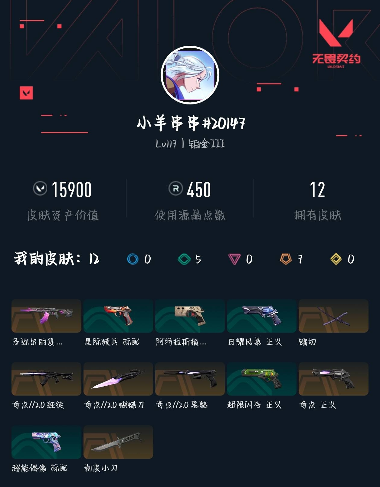 【无畏契约】【yhwww6891】等级:117,已用无畏点15900,已用源晶点450,橙皮:近战-剥皮小刀|正义-奇点|狂徒-奇点2.0|鬼魅-奇点2.0|近战-奇点2.0 蝴蝶刀|近战-镭切|狂徒-多弥尔的复仇__段位:铂金__绿皮:标配-超能偶像|正义-超限闪存|正义-日耀风暴|标配-星际猎兵__蓝皮:标配-阿特拉斯指挥部__英雄:尚勃勒|维斯|黑梦|斯凯|暮蝶|盖可|霓虹|壹决|星礈|k/o|幽影|夜露|钢锁|海神|奇乐|炼狱|铁臂|贤者|猎枭|钛狐|芮娜|零|捷风|蝰蛇|不死鸟|幻棱|雷兹|禁灭