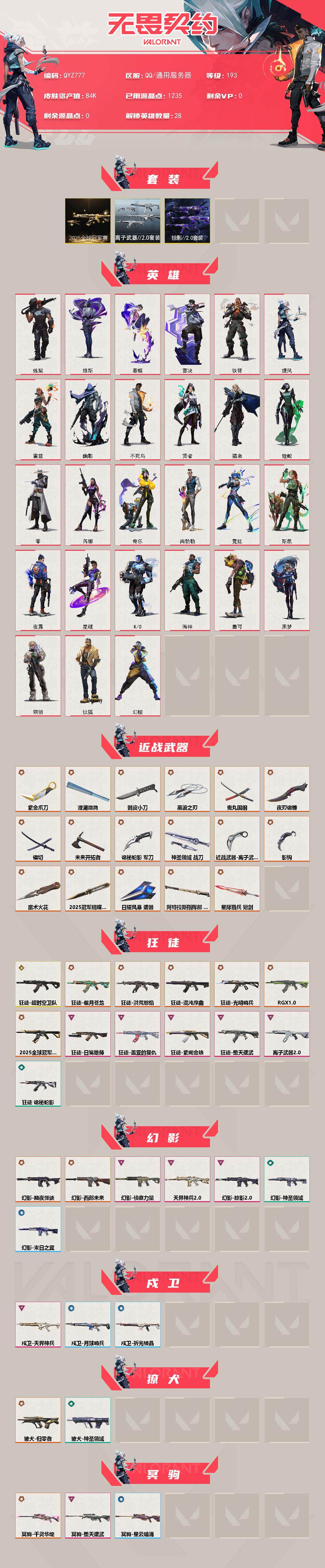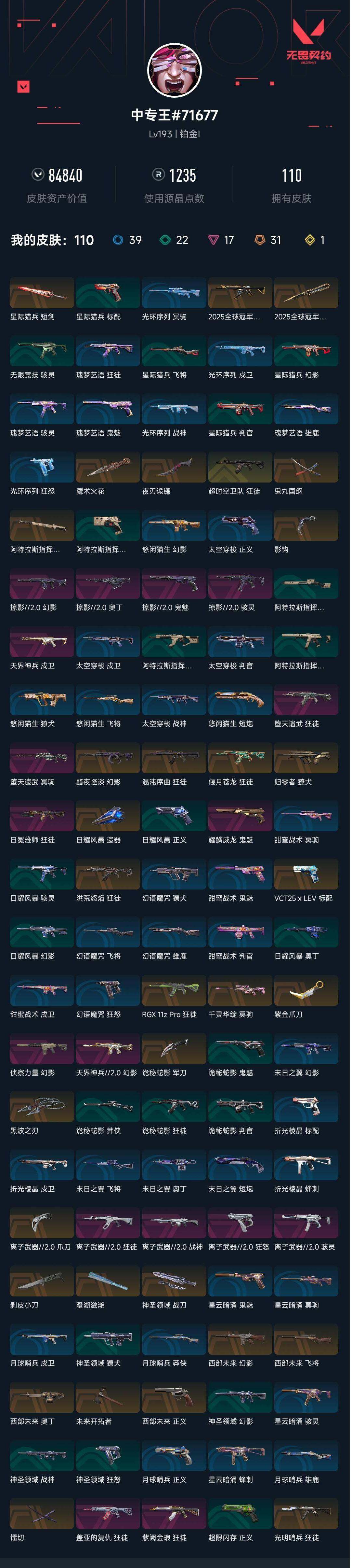 【qyz777】终极31/传奇1/卓越17/皮肤110/等级193/段位:铂金/2025全球冠军赛套装/西部未来/离子武器2.0/掠影2.0套装/幻棱/炼狱/维斯/暮蝶/钛狐/壹决/铁臂/捷风/雷兹/幽影/不死鸟/贤者/猎枭/蝰蛇/零/芮娜/奇乐/尚勃勒/霓虹/斯凯/夜露/星礈/k/o/海神/盖可/黑梦/钢锁/近战武器-2025全球冠军赛 蝴蝶刀/近战武器-魔术火花/近战武器-影钩/
