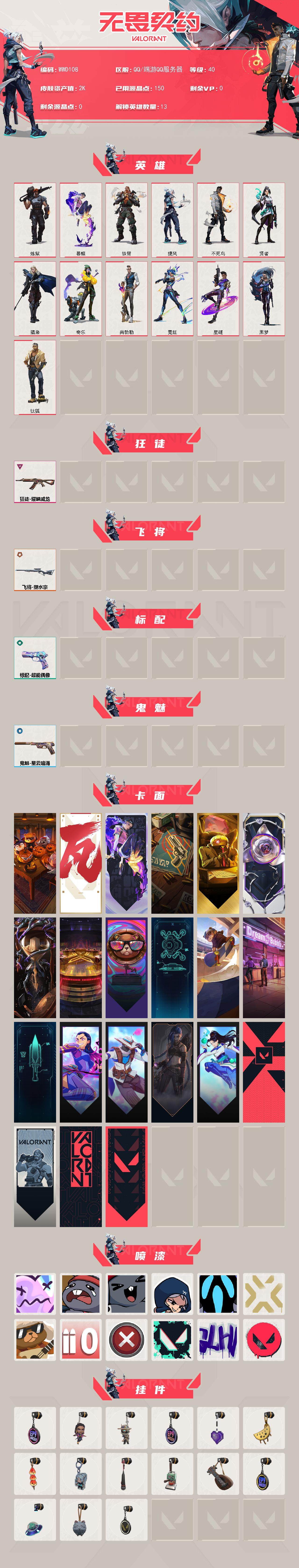 【wwd108】终极1/卓越1/皮肤4/等级40/段位:未定级/炼狱/暮蝶/钛狐/铁臂/捷风/不死鸟/贤者/猎枭/奇乐/尚勃勒/霓虹/星礈/黑梦/狂徒-耀鳞威龙/飞将-塑水宗/标配-超能偶像/鬼魅-星云暗涌/南瓜盛典 卡面/vct cn首冠 卡面/无畏契约:暮蝶 卡面/正义的化身 卡面/终章:生意人麦宝 卡面/铁之华 卡面/时间到 卡面/最高舞台 卡面/音熊登场 卡面/声感陷阱设计图