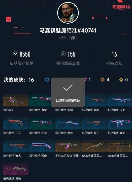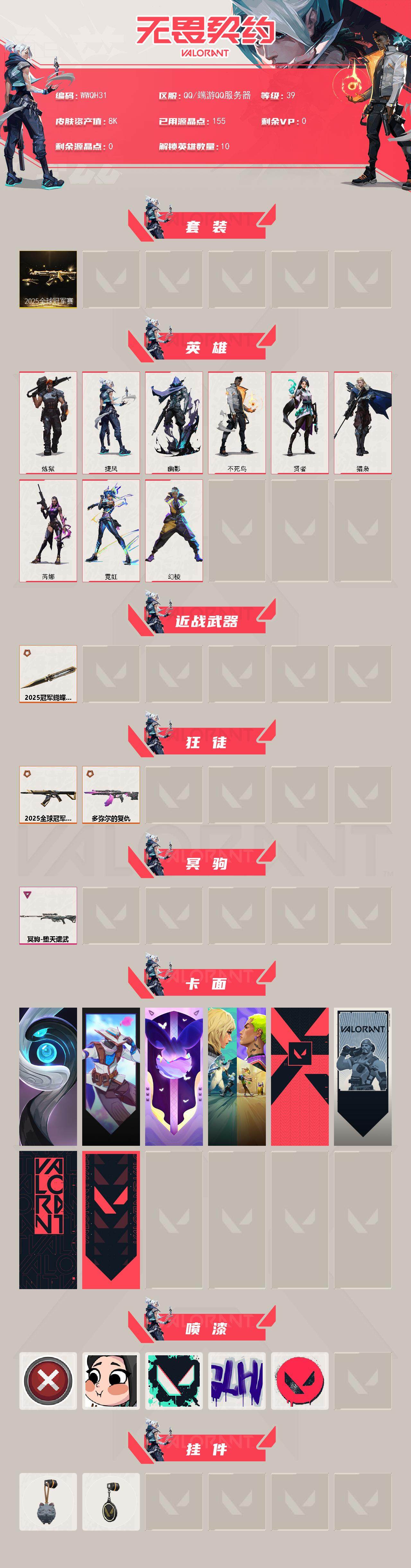 【wwqh31】终极4/卓越1/皮肤16/等级39/段位:白银/2025全球冠军赛套装/幻棱/炼狱/捷风/幽影/不死鸟/贤者/猎枭/芮娜/霓虹/近战武器-2025全球冠军赛 蝴蝶刀/狂徒-2025全球冠军赛/狂徒-多弥尔的复仇/冥驹-堕天遗武/聚合之力 卡面/无畏契约go!第一卷:零 卡面/化茧成蝶 卡面/钢锁vs盖可 卡面/代号红色 卡面/新兵报到 卡面/v契约 卡面/无畏契约 卡面
