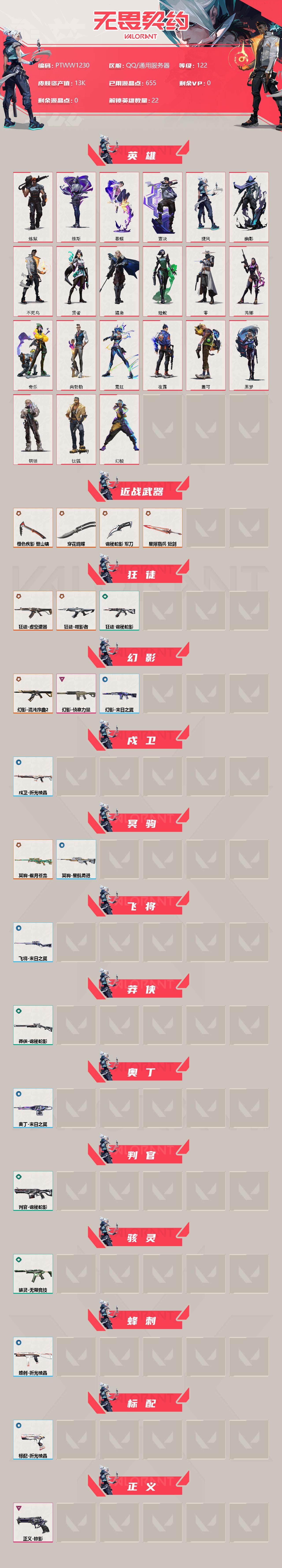 【ptww1230】【特价处理】【英雄】:幻棱,炼狱,维斯,暮蝶,钛狐,壹决,捷风,幽影,不死鸟,贤者,猎枭,蝰蛇,零,芮娜,奇乐,尚勃勒,霓虹,夜露,盖可,黑梦,钢锁 【近战 武器】:近战武器-穿花蝴蝶,近战武器-橙色疾影 登山镐,近战武器-诡秘蛇影 军刀,近战武器-星际猎兵 短剑 【狂徒】:狂徒-虚空遗器,狂徒-噬影者,狂徒-诡秘蛇影 【幻影】:幻影-混沌序曲//2.0,幻影-侦察力量,幻