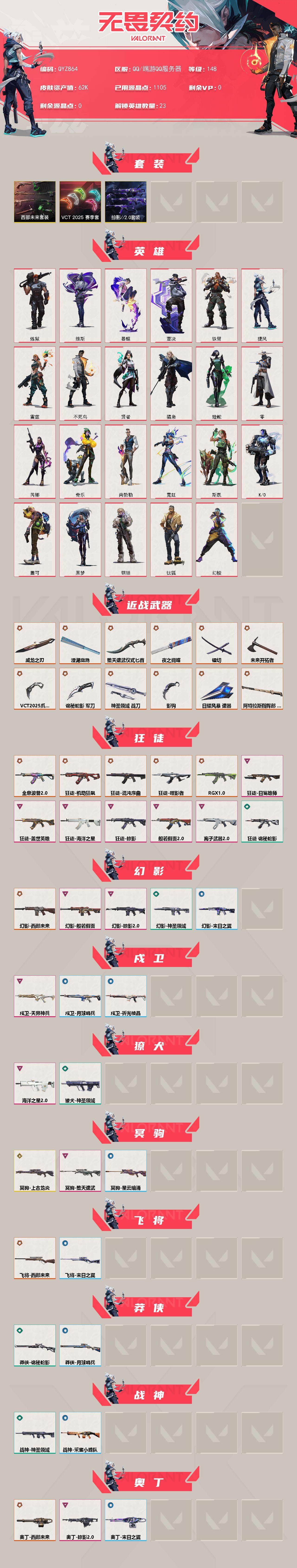 【qyz864】终极23/传奇1/卓越15/皮肤99/等级148/段位:超凡/vct 2025 赛季套装/西部未来套装/掠影//2.0套装/幻棱/炼狱/维斯/暮蝶/钛狐/壹决/铁臂/捷风/雷兹/不死鸟/贤者/猎枭/蝰蛇/零/芮娜/奇乐/尚勃勒/霓虹/斯凯/k/o/盖可/黑梦/钢锁/近战武器-影钩/近战武器-vct 2025 爪刀/近战武器-镭切/近战武器-威龙之刃/近战武器-澄湖潋滟/近战武器-夜之蝴蝶/近战武器-未来开拓者/近战武器-堕天遗武 仪式匕首/近战武器-诡秘蛇影 军刀/近战武器-神圣领域 战刀/近战武器-日耀风暴 遗器/近战武器-阿特拉斯指挥部 甩棍/狂徒-混沌序曲/狂徒-机动狂飙/狂徒-全息波普//2.0/狂徒-噬影者/狂徒-rgx 11z pro/狂徒-般若假面//2.0/狂徒-掠影/狂徒-盖世英雄/狂徒-海洋之星/狂徒-日冕雄师/狂徒-离子武器//2.0/狂徒-诡秘蛇影/幻影-西部未来/幻影-般若假面/幻影-掠影//2.0/幻影-神圣领域/幻影-末日之翼/戍卫-天界神兵/戍卫-月球哨兵/戍卫-折光棱晶/獠犬-海洋之星//2.0/獠犬-神圣领域/冥驹-上古龙炎/冥驹-堕天遗武/冥驹-星云暗涌/飞将-西部未来/飞将-末日之翼/莽侠-诡秘蛇影/莽侠-月球哨兵/战神-神圣领域/战神-采蜜小蜂队/奥丁-西部未来/奥丁-掠影//2.0/奥丁-末日之翼/判官-超能偶像/判官-诡秘蛇影/雄鹿-月球哨兵/骇灵-掠影//2.0/骇灵-星云暗涌/蜂刺-聚合之力/蜂刺-星云暗涌/蜂刺-折光棱晶/标配-折光棱晶/标配-vct25 x blg/正义-千灵华绽/正义-西部未来/正义-掠影/正义-复古浪潮/正义-月球哨兵/鬼魅-掠影//2.0/鬼魅-诡秘蛇影/鬼魅-采蜜小蜂队/鬼魅-星云暗涌/狂怒-神圣领域/狂怒-聚合之力/短炮-末日之翼/精灵大战 卡面/南瓜盛典 卡面/热舞环节 卡面/正义的化身 卡面/最高舞台 卡面/生意人麦宝 卡面/钢锁工牌 卡面/战术小伙伴的夏日 卡面/采蜜小蜂队 卡面/聚合之力 卡面/梦幻奶茶 卡面/零点嗅探设计图 卡面/终章:瓦娃脸雪糕 卡面/表象之下 卡面/沙雕爆能器 卡面/无畏契约go!第一卷:芮娜 卡面/清除名单 卡面/无畏契约go!第一卷:零 卡面/《双城之战》金克丝 卡面/铁臂设计图 卡面/代号红色 卡面/新兵报到 卡面/v契约 卡面/无畏契约 卡面/嗨宝南瓜灯 喷漆/控场勿近 喷漆/超级粉丝 喷漆/捷风差距 喷漆/聚合之力 喷漆/采蜜小蜂队 喷漆/梦幻小队 喷漆/五个全都齐了 喷漆/我的刀呢? 喷漆/禁止喷漆 喷漆/uwu 喷漆/新潮流 喷漆/双击点赞 喷漆/买装还是存钱 喷漆/胜利属于无畏契约 喷漆/glhf 喷漆/无畏契约 喷漆/悠闲鸡块 挂饰/伞绳 挂饰/第九季//第三幕 纪念币 挂饰/无畏契约go!第一卷 芮娜 挂饰/第九季//第二幕 纪念币 挂饰/袖珍捷风 挂饰/采蜜小蜂队 挂饰/第九季//第一幕 纪念币 挂饰/聚合之力 挂饰/第八季:白银 挂饰/第八季//第三幕 纪念币 挂饰/终章:扭结饼干 挂饰 /瓶中信 挂饰/传世莲华 挂饰/第八季//第二幕 纪念币 挂饰 /天外飞客 挂饰/第七季//第三幕 纪念币 挂饰/幸运中国结 挂饰/无畏契约 纪念币 挂饰