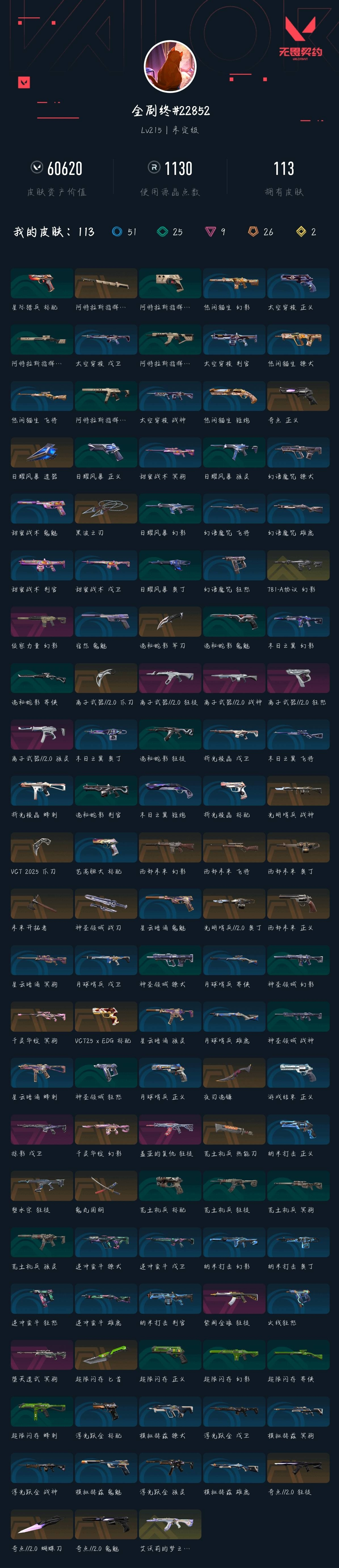 【无畏契约】【yhwww6897】等级:215,已用无畏点60620,已用源晶点1130,金皮:幻影-781-a协议|狂徒-艾沃莉的梦之翼__橙皮:奥丁-光明哨兵2.0|幻影-千灵华绽|近战-超限闪存 匕首|近战-黑波之刃|近战-夜刃诡镰|狂徒-塑水宗|冥驹-千灵华绽|正义-奇点|战神-光明哨兵|狂徒-奇点2.0|鬼魅-奇点2.0|近战-奇点2.0 蝴蝶刀|近战-荒土机兵 热能刀|近战-鬼丸国纲|近战-神圣领域 战刀|标配-vct25 x edg|飞将-西部未来|正义-西部未来|奥丁-西部未来|幻影-西部未来|近战-未来开拓者|近战-vct 2025 爪刀|近战-诡秘蛇影 军刀|近战-离子武器2.0 爪刀|近战-日耀风暴 遗器|近战-阿特拉斯指挥部 甩棍__紫皮:幻影-侦察力量|狂徒-盖亚的复仇|冥驹-堕天遗武|狂徒-紫阙金琅|戍卫-掠影|战神-离子武器2.0|狂徒-离子武器2.0|狂怒-离子武器2.0|骇灵-离子武器2.0__段位:未定级__蓝皮:标配-艺高胆大|正义-游戏结束|鬼魅-宿怨|判官-纳米打击|正义-纳米打击|奥丁-纳米打击|幻影-纳米打击|雄鹿-逆冲蛮牛|狂怒-逆冲蛮牛|戍卫-逆冲蛮牛|獠犬-逆冲蛮牛|鬼魅-星云暗涌|骇灵-星云暗涌|正义-月球哨兵|莽侠-月球哨兵|戍卫-月球哨兵|雄鹿-月球哨兵|骇灵-浮光跃金|标配-浮光跃金|戍卫-浮光跃金|战神-浮光跃金|鬼魅-模拟赫兹|獠犬-模拟赫兹|冥驹-模拟赫兹|雄鹿-模拟赫兹|冥驹-星云暗涌|蜂刺-星云暗涌|蜂刺-折光棱晶|戍卫-折光棱晶|标配-折光棱晶|飞将-末日之翼|幻影-末日之翼|短炮-末日之翼|奥丁-末日之翼|鬼魅-甜蜜战术|判官-甜蜜战术|戍卫-甜蜜战术|雄鹿-幻语魔咒|獠犬-幻语魔咒|飞将-幻语魔咒|狂怒-幻语魔咒|正义-太空穿梭|战神-太空穿梭|判官-太空穿梭|戍卫-太空穿梭|骇灵-阿特拉斯指挥部|莽侠-阿特拉斯指挥部|标配-阿特拉斯指挥部|狂徒-阿特拉斯指挥部__绿皮:狂徒-荒土机兵|标配-荒土机兵|骇灵-荒土机兵|冥驹-荒土机兵|獠犬-神圣领域|狂怒-神圣领域|战神-神圣领域|幻影-神圣领域|正义-超限闪存|莽侠-超限闪存|幻影-超限闪存|蜂刺-超限闪存|判官-诡秘蛇影|鬼魅-诡秘蛇影|莽侠-诡秘蛇影|狂徒-诡秘蛇影|正义-日耀风暴|幻影-日耀风暴|奥丁-日耀风暴|短炮-悠闲猫生|飞将-悠闲猫生|幻影-悠闲猫生|獠犬-悠闲猫生|标配-星际猎兵__英雄:尚勃勒|维斯|黑梦|斯凯|暮蝶|盖可|霓虹|壹决|星礈|k/o|幽影|夜露|钢锁|海神|奇乐|炼狱|铁臂|贤者|猎枭|钛狐|芮娜|零|捷风|蝰蛇|不死鸟|幻棱|雷兹