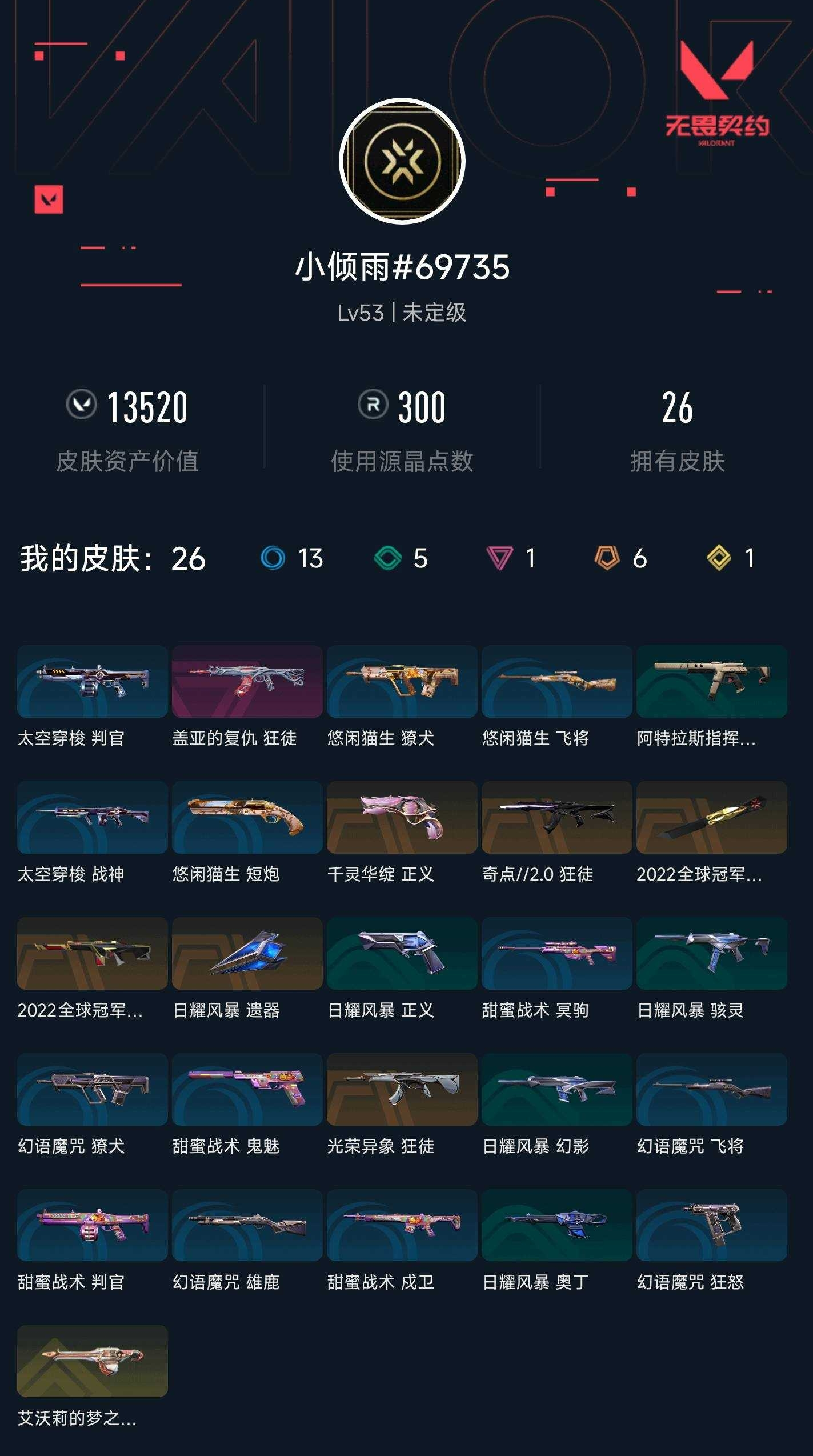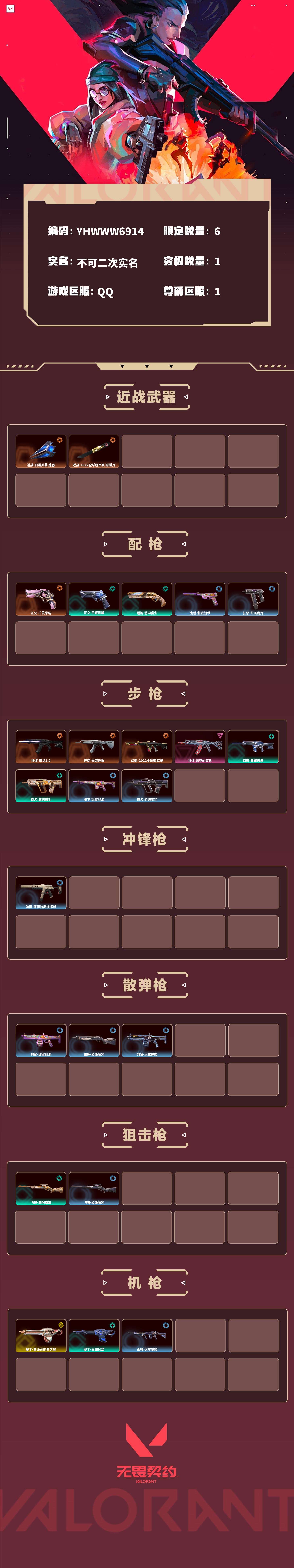 【无畏契约】【yhwww6914】等级:53,已用无畏点13520,已用源晶点300,金皮:奥丁-艾沃莉的梦之翼__橙皮:正义-千灵华绽|狂徒-奇点2.0|狂徒-光荣异象|近战-日耀风暴 遗器|近战-2022全球冠军赛 蝴蝶刀|幻影-2022全球冠军赛__紫皮:狂徒-盖亚的复仇__段位:未定级__绿皮:正义-日耀风暴|幻影-日耀风暴|奥丁-日耀风暴|短炮-悠闲猫生|飞将-悠闲猫生|獠犬-悠闲猫生__蓝皮:鬼魅-甜蜜战术|判官-甜蜜战术|戍卫-甜蜜战术|雄鹿-幻语魔咒|獠犬-幻语魔咒|飞将-幻语魔咒|狂怒-幻语魔咒|战神-太空穿梭|判官-太空穿梭|骇灵-阿特拉斯指挥部__英雄:尚勃勒|暮蝶|盖可|霓虹|壹决|钢锁|炼狱|铁臂|贤者|猎枭|芮娜|零|捷风|不死鸟|雷兹