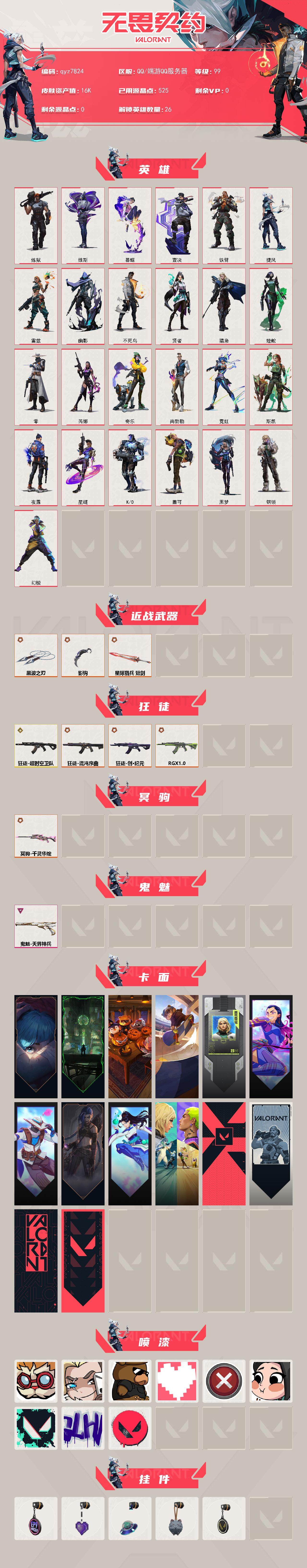 【qyz7824】精品黑波掠夺爪小号-喜欢的来吧低价出-qyz7824-近战武器皮肤:-黑波之刃影钩-步呛皮肤:-狂徒-混沌序曲狂徒-创纪元狂徒-rgx-11z-pro狂徒-超时空卫队-佩呛皮肤:-鬼魅-天界神兵-狙击呛皮肤:-冥驹-千灵华绽-亮点:-【qyz7824】【英雄】:幻棱,炼狱,维斯,暮蝶,壹决,铁臂,捷风,雷兹,幽影,不死鸟,贤者,猎枭,蝰蛇,零,芮娜,奇乐,尚勃勒,霓虹,斯凯,夜露,星礈,k/o,盖可,黑梦,钢锁【近战-武器】:近战武器-影钩,近战武器-黑波之刃,近战武器-星际猎兵-短剑【狂徒】:狂徒-超时空卫队,狂徒-混沌序曲,狂徒-创纪元,狂徒-rgx-11z-pro【冥驹】:冥驹-千灵华绽【鬼魅】:鬼魅-天界神兵【卡面】:《双城之战》拥抱-卡面,欢迎来到底城-卡面,南瓜盛典-卡面,clutch-卡面,钢锁工牌-卡面,无畏契约go!第一卷:芮娜-卡面,无畏契约go!第一卷:零-卡面,《双城之战》金克丝-卡面,无畏契约go!第一卷:贤者-卡面,钢锁vs盖可-卡面,代号红色-卡面,新兵报到-卡面,v契约-卡面,无畏契约-卡面【喷漆】:都算到了-喷漆,永远的答案-喷漆,三熊合一-喷漆,双击点赞-喷漆,买装还是存钱-喷漆,辣得好下饭-喷漆,胜利属于无畏契约-喷漆,glhf-喷漆,无畏契约-喷漆【挂饰】:第九季//第三幕-纪念币-挂饰,薰衣草之心-挂饰,天外飞客-挂饰,《双城之战》魄罗-挂饰,无畏契约-纪念币-挂饰