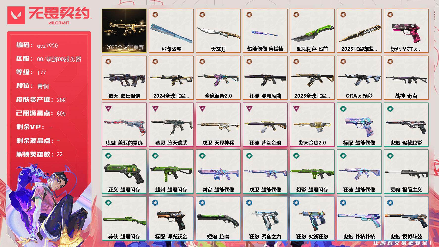 2025冠军颗秒狂徒24冠军-混沌紫金全息波普狂徒-qyz7920-亮点皮肤:-幻影-2024全球冠军赛-套装:-2025全球冠军赛-近战武器皮肤:-澄湖潋滟天玄刀超能偶像-应援棒匕首-超限闪存2025全球冠军赛-蝴蝶刀-步呛皮肤:-狂徒-紫阙金琅戍卫-天界神兵狂徒-全息波普//20狂徒-混沌序曲獠犬-黯夜怪谈2025全球冠军赛-狂徒-佩呛皮肤:-鬼魅-盖亚的复仇标配-vctxkru-冲锋呛皮肤:-骇灵-堕天遗武-机呛皮肤:-战神-奇点奥丁-紫阙金琅20-亮点:-【qyz7920】【套装】:2025全球冠军赛套装【英雄】:幻棱,炼狱,维斯,暮蝶,钛狐,壹决,铁臂,捷风,幽影,不死鸟,贤者,猎枭,蝰蛇,零,芮娜,尚勃勒,k/o,海神,盖可,黑梦,钢锁【近战-武器】:近战武器-2025全球冠军赛-蝴蝶刀,近战武器-澄湖潋滟,近战武器-超能偶像-应援棒,近战武器-超限闪存-匕首,近战武器-天玄刀【狂徒】:狂徒-2025全球冠军赛,狂徒-混沌序曲,狂徒-全息波普//20,狂徒-a-x-颗秒,狂徒-紫阙金琅,狂徒-超能偶像【幻影】:幻影-2024全球冠军赛,幻影-超限闪存,幻影-聚合之力【戍卫】:戍卫-天界神兵,戍卫-超能偶像,戍卫-彩虹魔力小白马,戍卫-浮光跃金【獠犬】:獠犬-黯夜怪谈,獠犬-采蜜小蜂队,獠犬-模拟赫兹【冥驹】:冥驹-极简主义,冥驹-模拟赫兹【飞将】:飞将-聚合之力【莽侠】:莽侠-超限闪存【战神】:战神-奇点,战神-采蜜小蜂队,战神-浮光跃金【奥丁】:奥丁-紫阙金琅//20【判官】:判官-超能偶像,判官-采蜜小蜂队【雄鹿】:雄鹿-模拟赫兹【骇灵】:骇灵-堕天遗武,骇灵-浮光跃金【蜂刺】:蜂刺-超限闪存,蜂刺-聚合之力【标配】:标配-超能偶像,标配-浮光跃金【vct手呛】:标配-vct-x-krü【正义】:正义-超限闪存,正义-纳米打击【鬼魅】:鬼魅-盖亚的复仇,鬼魅-诡秘蛇影,鬼魅-采蜜小蜂队,鬼魅-模拟赫兹,鬼魅-扑棱扑棱,鬼魅-星云暗涌【狂怒】:狂怒-火线狂怒,狂怒-聚合之力【短炮】:短炮-蛇吻【卡面】:终章:激斗汉堡-卡面,进入射程-卡面,《双城之战》拥抱-卡面,精灵大战-卡面,欢迎来到底城-卡面,南瓜盛典-卡面,vct-cn首冠-卡面,唱片的故事-卡面,钢弓与箭弦-卡面,无畏契约:暮蝶-卡面,排除故障-卡面,战术桌游-卡面,悠享食光-卡面,修车达人-卡面,热舞环节-卡面