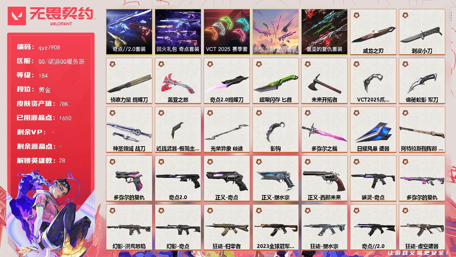 精品黄金号-低价捡漏出-喜欢的来吧-带23狂徒-qyz7908-亮点皮肤:-狂徒-2023全球冠军赛-套装:-奇点套装盖亚的复仇套装奇点//20套装vct-2025赛季礼包-近战武器皮肤:-盖亚之怒蝴蝶刀-侦察力量剥皮小刀威龙之刃匕首-超限闪存蝴蝶刀-奇点//20神圣领域-战刀未来开拓者vct-2025-爪刀诡秘蛇影极简主义20-爪刀歧途影钩-步呛皮肤:-獠犬-赛博迷城幻影-奇点狂徒-紫阙金琅戍卫-盖亚的复仇狂徒-盖亚的复仇幻影-侦察力量狂徒-归零者狂徒-塑水宗幻影-洪荒怒焰狂徒-日冕雄师狂徒-奇点//20狂徒-掠影狂徒-虚空遗器狂徒-噬影者狂徒-光荣异象-佩呛皮肤:-正义-奇点鬼魅-盖亚的复仇正义-塑水宗正义-离子武器鬼魅-奇点//20正义-西部未来-狙击呛皮肤:-飞将-盖亚的复仇冥驹-归零者冥驹-光荣异象-冲锋呛皮肤:-骇灵-奇点-亮点:-【qyz7908】【套装】:多弥尔的复仇套装,vct-2025-赛季套装,奇点//20套装,回火礼包:奇点套装,盖亚的复仇套装【英雄】:幻棱,炼狱,维斯,暮蝶,钛狐,壹决,铁臂,捷风,雷兹,幽影,不死鸟,贤者,猎枭,蝰蛇,零,芮娜,奇乐,尚勃勒,霓虹,斯凯,夜露,星礈,k/o,海神,盖可,黑梦,钢锁【近战-武器】:近战武器-多弥尔之裁,近战武器-影钩,近战武器-光荣异象-歧途,近战武器-侦察力量-蝴蝶刀,近战武器-剥皮小刀,近战武器-奇点//20-蝴蝶刀,近战武器-vct-2025-爪刀,近战武器-威龙之刃,近战武器-极简主义//20-爪刀,近战武器-未来开拓者,近战武器-超限闪存-匕首,近战武器-盖亚之怒,近战武器-诡秘蛇影-军刀,近战武器-神圣领域-战刀,近战武器-日耀风暴-遗器,近战武器-阿特拉斯指挥部-甩棍【狂徒】:狂徒-2023全球冠军赛,狂徒-归零者,狂徒-奇点//20,狂徒-塑水宗,狂徒-虚空遗器,狂徒-噬影者,狂徒-光荣异象,狂徒-多弥尔的复仇,狂徒-掠影,狂徒-盖亚的复仇,狂徒-日冕雄师,狂徒-紫阙金琅,狂徒-弧光异彩,狂徒-诡秘蛇影【幻影】:幻影-洪荒怒焰,幻影-奇点,幻影-侦察力量,幻影-超限闪存,幻影-神圣领域,幻影-末日之翼【戍卫】:戍卫-多弥尔的复仇,戍卫-盖亚的复仇,戍卫-彩梦之城,戍卫-浮光跃金,戍卫-月球哨兵,戍卫-折光棱晶【獠犬】:獠犬-赛博迷城,獠犬