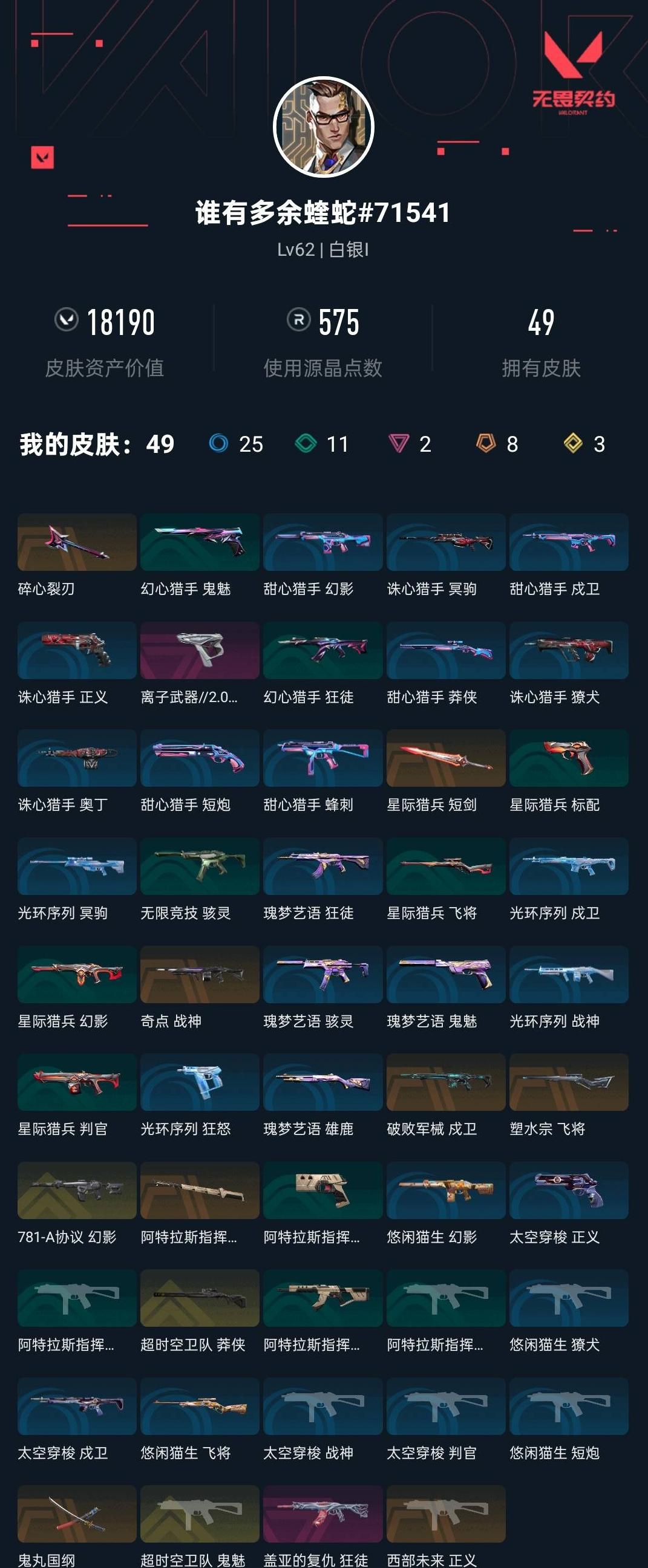 【无畏契约】【yhwww6557】等级:62,已用无畏点18190,已用源晶点590,金皮:幻影-781-a协议|莽侠-超时空卫队|鬼魅-超时空卫队__橙皮:飞将-塑水宗|戍卫-破败军械|战神-奇点|近战-鬼丸国纲|正义-西部未来|近战-阿特拉斯指挥部 甩棍|近战-星际猎兵 短剑__紫皮:狂徒-盖亚的复仇|狂怒-离子武器2.0__段位:白银__绿皮:骇灵-无限竞技|短炮-悠闲猫生|飞将-悠闲猫生|幻影-悠闲猫生|獠犬-悠闲猫生|判官-星际猎兵|飞将-星际猎兵|标配-星际猎兵|狂徒-幻心猎手|鬼魅-幻心猎手__蓝皮:正义-太空穿梭|战神-太空穿梭|判官-太空穿梭|戍卫-太空穿梭|骇灵-阿特拉斯指挥部|莽侠-阿特拉斯指挥部|标配-阿特拉斯指挥部|狂徒-阿特拉斯指挥部|狂怒-光环序列|戍卫-光环序列|冥驹-光环序列|战神-光环序列|狂徒-瑰梦艺语|鬼魅-瑰梦艺语|骇灵-瑰梦艺语|雄鹿-瑰梦艺语|蜂刺-甜心猎手|短炮-甜心猎手|莽侠-甜心猎手|幻影-甜心猎手|戍卫-甜心猎手|正义-诛心猎手|冥驹-诛心猎手|獠犬-诛心猎手|奥丁-诛心猎手__英雄:尚勃勒|盖可|壹决|k/o|幽影|夜露|炼狱|贤者|猎枭|钛狐|芮娜|捷风|不死鸟|幻棱|禁灭