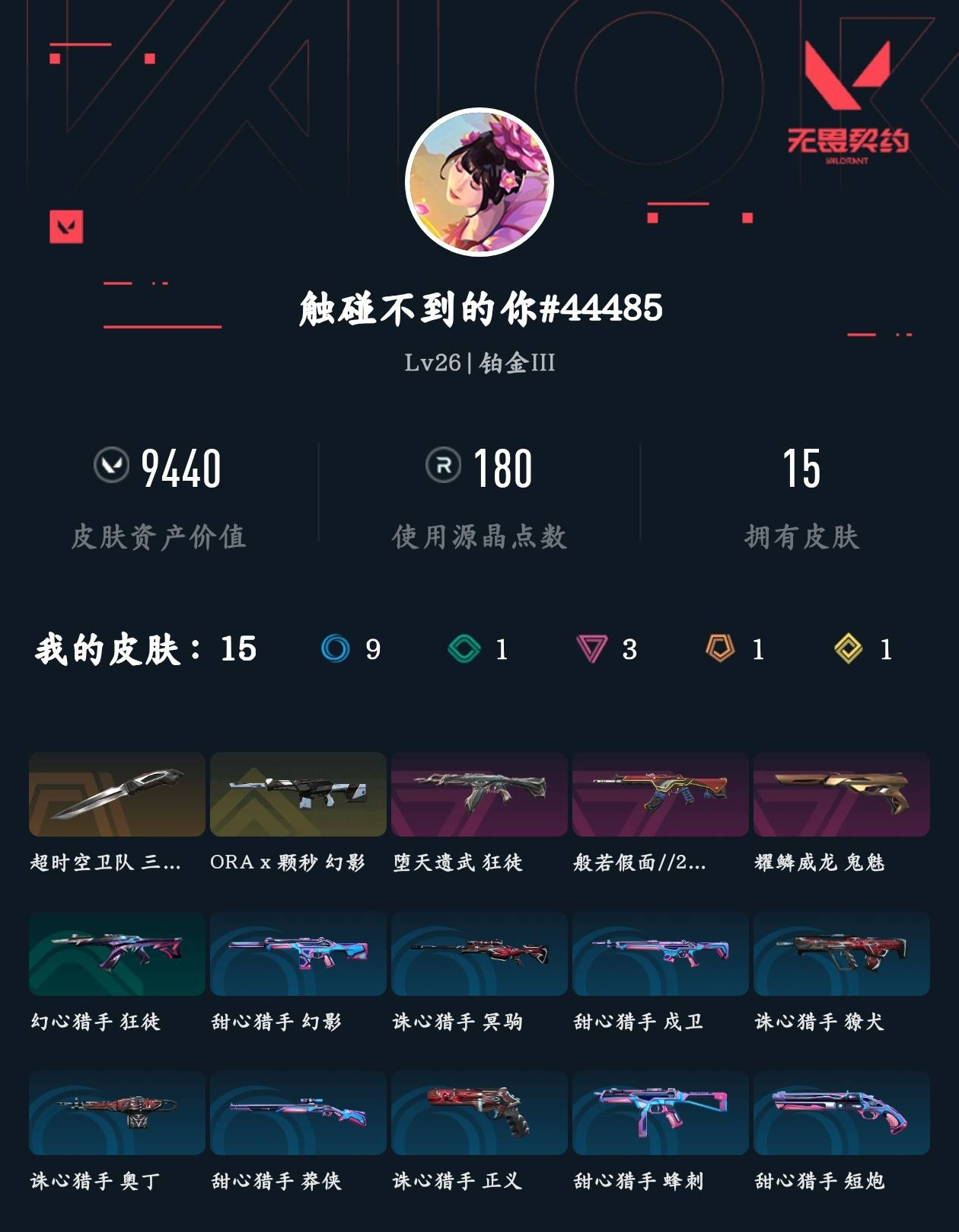 【无畏契约】【yhwww6910】等级:26,已用无畏点9440,已用源晶点180,紫皮:鬼魅-耀鳞威龙|狂徒-堕天遗武|狂徒-般若假面2.0__段位:铂金__橙皮:近战-超时空卫队 三棱军刺__英雄:暮蝶|壹决|炼狱|贤者|猎枭|芮娜|捷风|不死鸟|禁灭__蓝皮:蜂刺-甜心猎手|短炮-甜心猎手|莽侠-甜心猎手|幻影-甜心猎手|戍卫-甜心猎手|正义-诛心猎手|冥驹-诛心猎手|獠犬-诛心猎手|奥丁-诛心猎手__绿皮:狂徒-幻心猎手__金皮:幻影-a x 颗秒