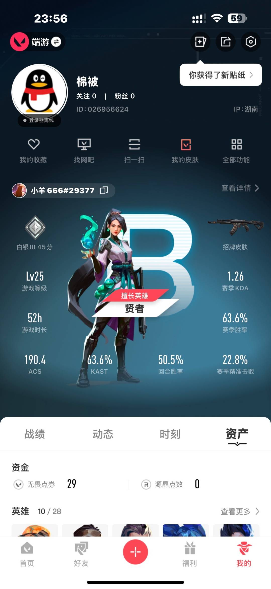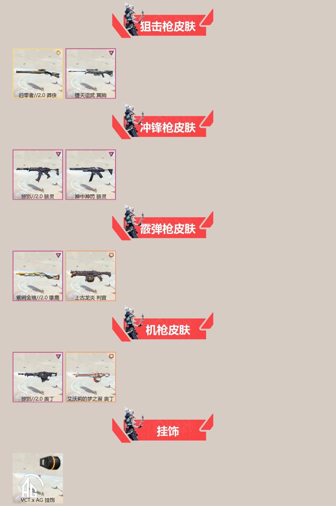 5橙皮 3金皮 8紫皮 24皮肤 10英雄 21卡面 410已用源晶 白银段位 【套装】:掠影2.0套装 【近战武器皮肤】:影钩 【佩呛皮肤】:正义-掠影鬼魅-掠影2.0标配-vct25xag 【冲锋呛皮肤】:骇灵-神中神罚骇灵-掠影2.0 【霰弹呛皮肤】:判官-上古龙炎雄鹿-紫阙金琅2.