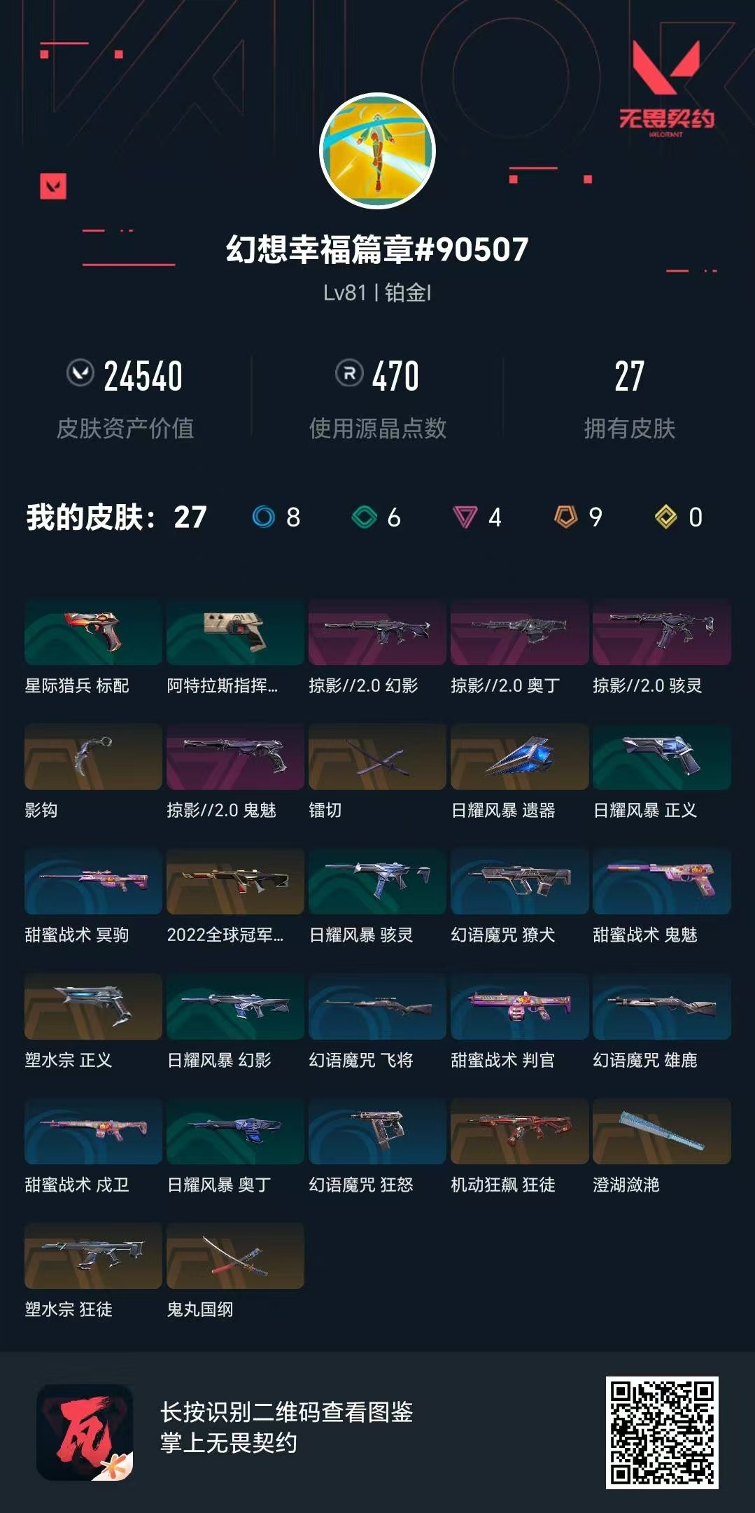 [14442529]9橙皮 4紫皮 27皮肤 17英雄 59卡面 470已用源晶 铂金段位 【套装】:掠影2.0套装 【近战武器皮肤】:镭切鬼丸国纲影钩澄湖潋滟 【佩呛皮肤】:鬼魅-掠影2.0正义-塑水宗 【冲锋呛皮肤】:骇灵-掠影2.0 【步呛皮肤】:幻影-掠影2.0狂徒-塑水宗狂徒-机动狂飙 【机呛皮肤】:奥丁-掠影2.0 【挂饰】:薰衣草之心挂饰鱼骨头挂饰双城之战小蛋糕挂饰双城之战魄罗挂饰神中神挂饰蓄势待滚挂饰飞刀挂饰