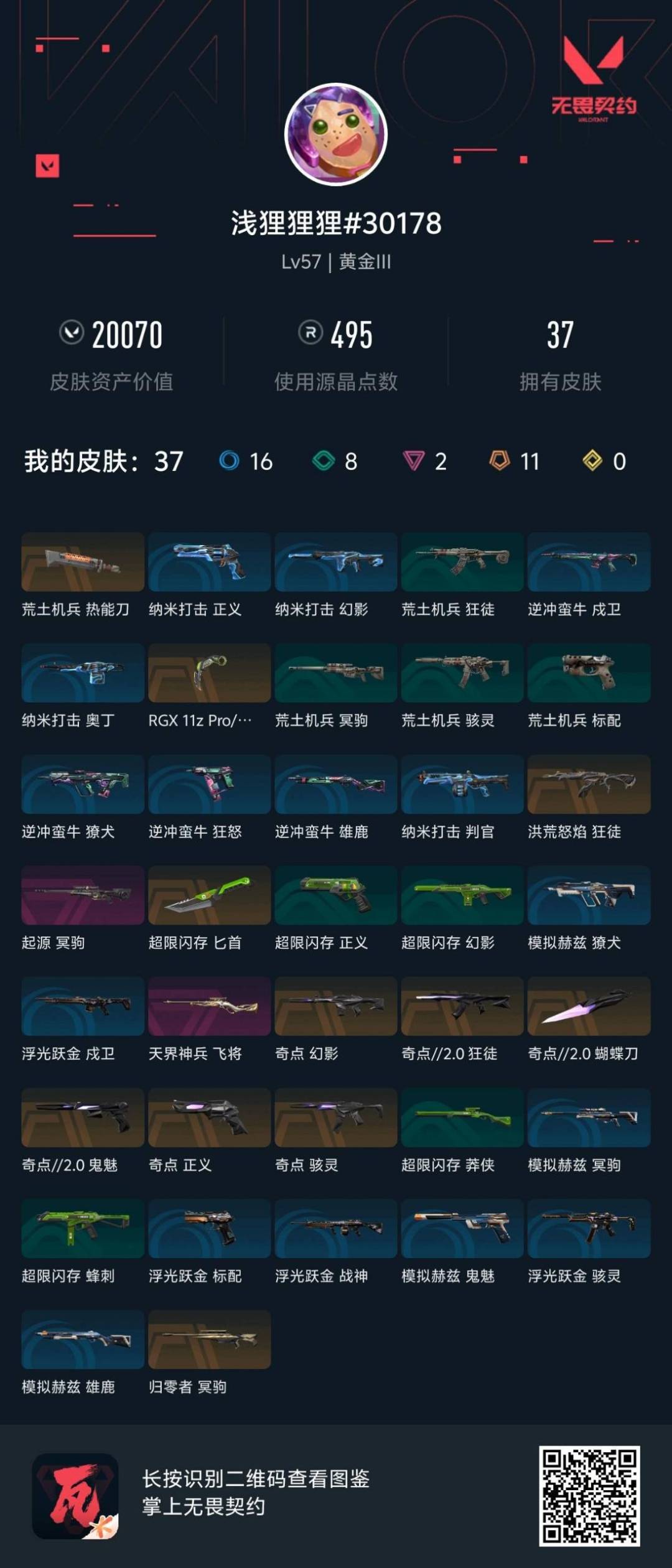 11橙皮 2紫皮 37皮肤 16英雄 52卡面 495已用源晶 黄金段位 【套装】:奇点//2.0套装 【近战武器皮肤】:匕首-超限闪存蝴蝶刀-奇点//2.0荒土机兵热能刀爪刀-rgx 11z pro 3.0 【佩呛皮肤】:鬼魅-奇点//2.0正义-奇点 【冲锋呛皮肤】:骇灵-奇点 【步呛