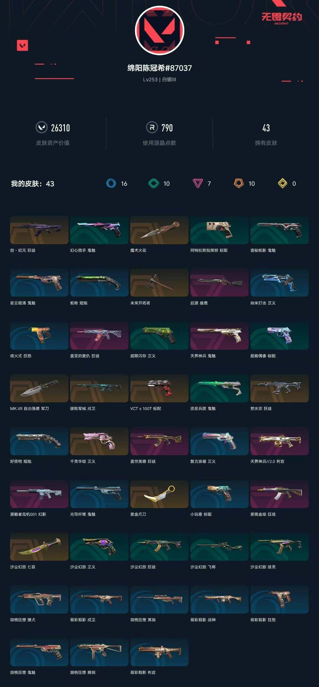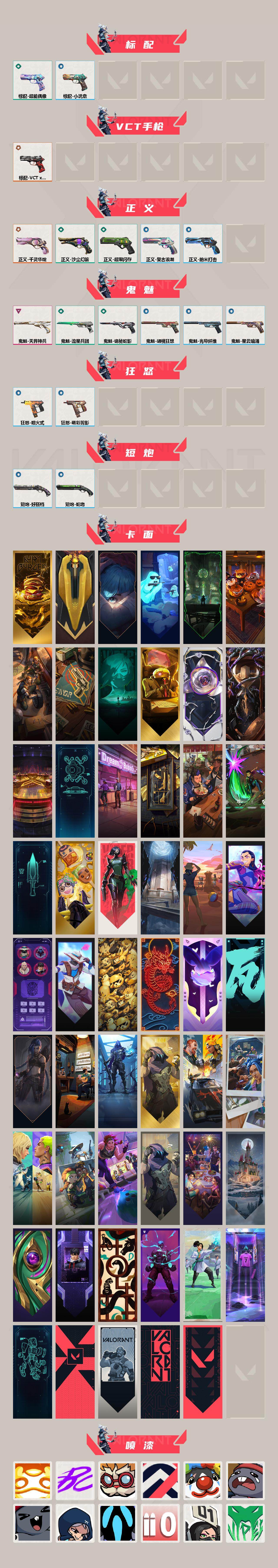 [14449457]【英雄】:幻棱,炼狱,维斯,暮蝶,钛狐,壹决,铁臂,捷风,雷兹,幽影,不死鸟,贤者,猎枭,蝰蛇,零,芮娜,奇乐,尚勃勒,霓虹,斯凯,夜露,星礈,k/o,海神,盖可,黑梦,钢锁 【近战 武器】:近战武器-魔术火花,近战武器-紫金爪刀,近战武器-未来开拓者,近战武器-mk.vii 自由强袭 军刀,近战武器-沙尘幻旅 匕首,近战武器-魔术火花 【狂徒】:狂徒-塑水宗,狂徒-创·纪元,狂徒-盖世英雄,狂徒-盖亚的复仇,狂徒-紫阙金琅,狂徒-沙尘幻旅 【幻影】:幻影-源能者危机001 【戍卫】:戍卫-破败军械,戍卫-萌彩剪影 【獠犬】:獠犬-胡桃狂想 【冥驹】:冥驹-胡桃狂想 【飞将】:飞将-沙尘幻旅 【战神】:战神-萌彩剪影 【判官】:判官-天界神兵//2.0,判官-萌彩剪影 【雄鹿】:雄鹿-起源 【骇灵】:骇灵-沙尘幻旅 【蜂刺】:蜂刺-胡桃狂想 【标配】:标配-超能偶像,标配-小玩意 【vct手呛】:标配-vct x 100t 【正义】:正义-千灵华绽,正义-超限闪存,正义-沙尘幻旅,正义-复古浪潮,正义-纳米打击 【鬼魅】:鬼魅-天界神兵,鬼魅-流星兵团,鬼魅-诡秘蛇影,鬼魅-光导纤维,鬼魅-胡桃狂想,鬼魅-星云暗涌 【狂怒】:狂怒-萌彩剪影,狂怒-喷火式 【短炮】:短炮-好搭档,短炮-蛇吻 【卡面】:终章:激斗汉堡 卡面,进入射程 卡面,《双城之战》拥抱 卡面,精灵大战 卡面,欢迎来到底城 卡面,南瓜盛典 卡面,修车达人 卡面,正义的化身 卡面,至黑之夜 卡面,终章:生意人麦宝 卡面,铁之华 卡面,时间到 卡面,最高舞台 卡面,声感陷阱设计图 卡面,梦幻奶茶 卡面,终章:打造专属狂徒 卡面,趁热吃 卡面,源能反应 卡面,零点嗅探设计图 卡面,终章:瓦娃脸雪糕 卡面,无畏契约:蝰蛇 卡面,表象之下 卡面,沙雕爆能器 卡面,无畏契约go!第一卷:芮娜 卡面,清除名单 卡面,无畏契约go!第一卷:零 卡面,终章:同步耍酷 卡面,龍记 卡面,化茧成蝶 卡面,先瓦为敬 绿色 卡面,《双城之战》金克丝 卡面,完美调谐 卡面 ,暗呛 卡面,终章:黑影先生的咖啡! 卡面,铁臂vs雷兹 卡面,纪念照 p2 卡面,钢锁vs盖可 卡面,别冒尖 卡面,一击全倒 卡面,黑影先生的咖啡! 卡面,天台狂欢 卡面,胡桃狂想 卡面,沙尘幻旅 卡面,壹决工牌 卡面,萌彩剪影 卡面,势不可挡//k