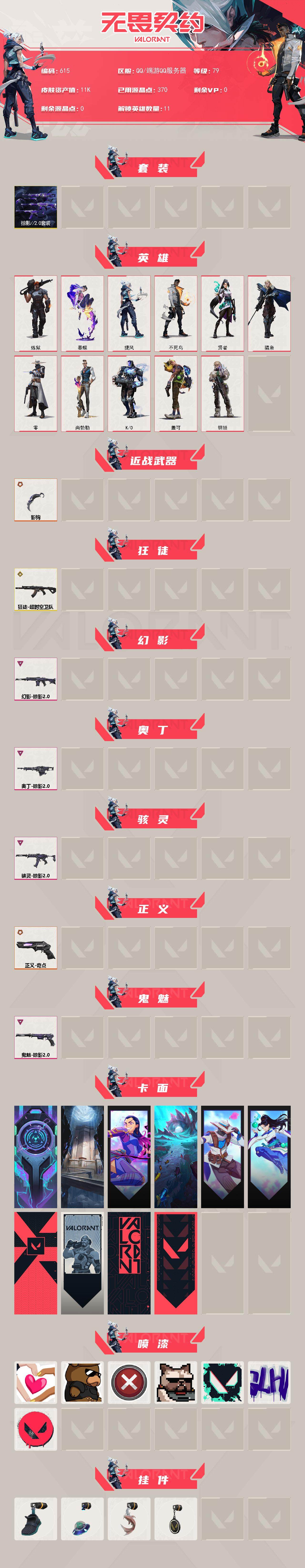 [14457275]【套装】:掠影//2.0套装 【英雄】:炼狱,暮蝶,捷风,不死鸟,贤者,猎枭,零,尚勃勒,k/o,盖可,钢锁 【近战 武器】:近战武器-影钩 【狂徒】:狂徒-超时空卫队 【幻影】:幻影-掠影//2.0 【奥丁】:奥丁-掠影//2.0 【骇灵】:骇灵-掠影//2.0 【正义】:正义-奇点 【鬼魅】:鬼魅-掠影//2.0 【卡面】:抑制技术 卡面,表象之下 卡面,无畏契约go!第一卷:芮娜 卡面,珍珠棘贝 卡面,无畏契约go!第一卷:零 卡面,无畏契约go!第一卷:贤者 卡面,代号红色 卡面,新兵报到 卡面,v契约 卡面,无畏契约 卡面 【喷漆】:双人比心 喷漆,三熊合一 喷漆,买装还是存钱 喷漆,关门放狗 喷漆,胜利属于无畏契约 喷漆,glhf 喷漆,无畏契约 喷漆 【挂饰】:瞬云履 挂饰,天外飞客 挂饰,红鳞松叶 挂饰,无畏契约 纪念币 挂饰