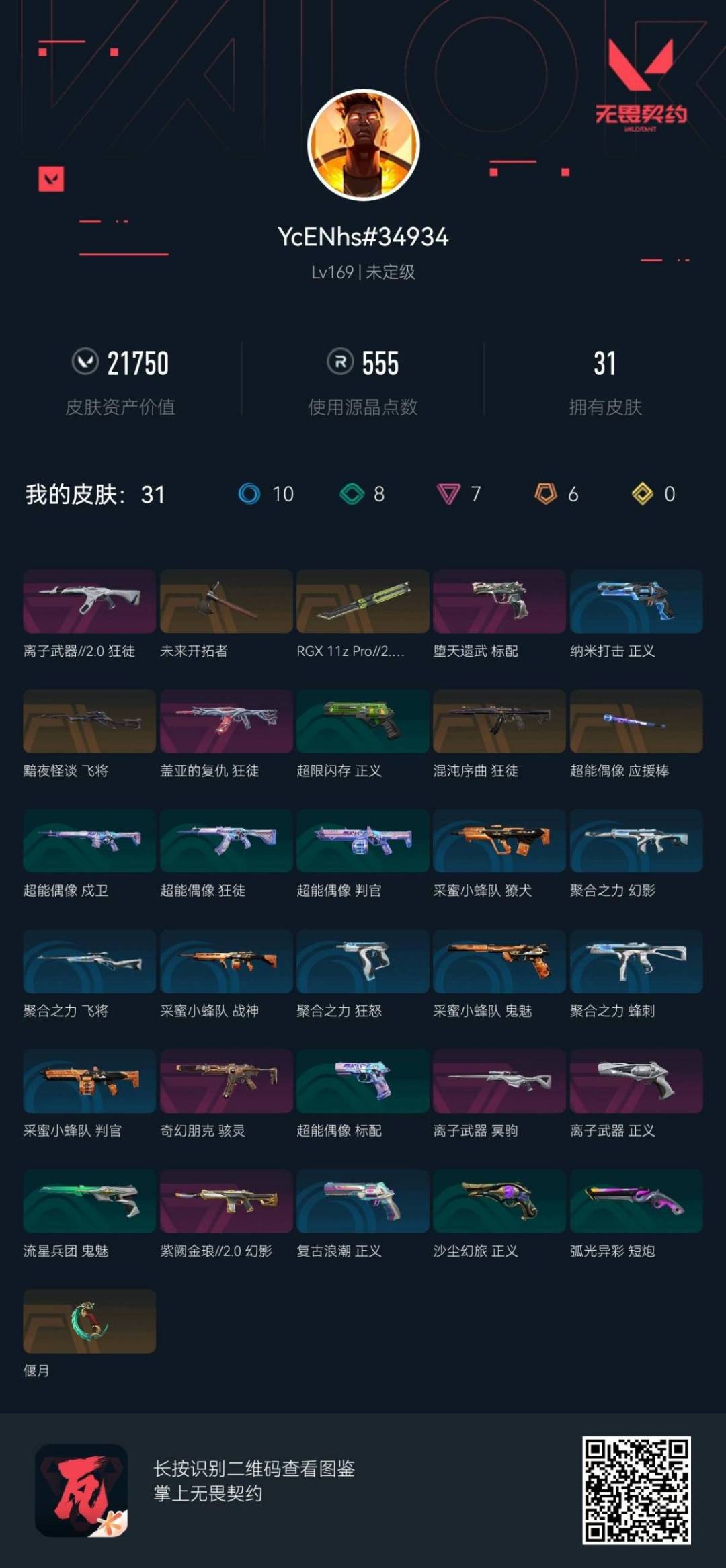6橙皮 7紫皮 31皮肤 27英雄 80卡面 555已用源晶 未定级段位 【近战武器皮肤】:未来开拓者rgx 11z pro//2.0 蝴蝶刀偃月超能偶像 应援棒 【佩呛皮肤】:正义-离子武器标配-堕天遗武 【冲锋呛皮肤】:骇灵-奇幻朋克 【步呛皮肤】:狂徒-离子武器2.0狂徒-混沌序曲