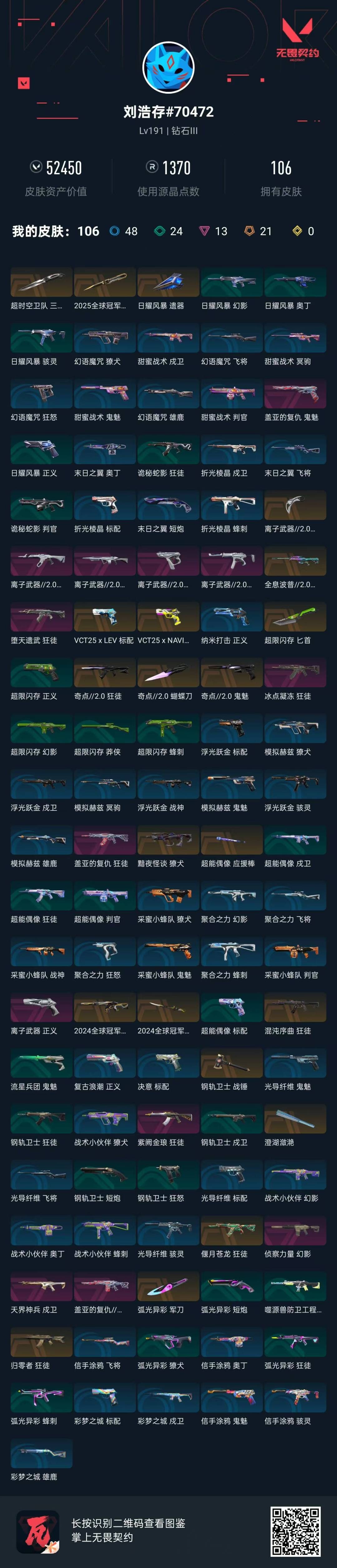 21橙皮 13紫皮 106皮肤 28英雄 162卡面 1370已用源晶 钻石段位 【亮点皮肤】:幻影-2024全球冠军赛战刀-2024全球冠军赛 【套装】:奇点//2.0套装离子武器2.02024全球冠军赛套装 【近战武器皮肤】:匕首-超限闪存战锤-钢轨卫士蝴蝶刀-奇点//2.0离子武