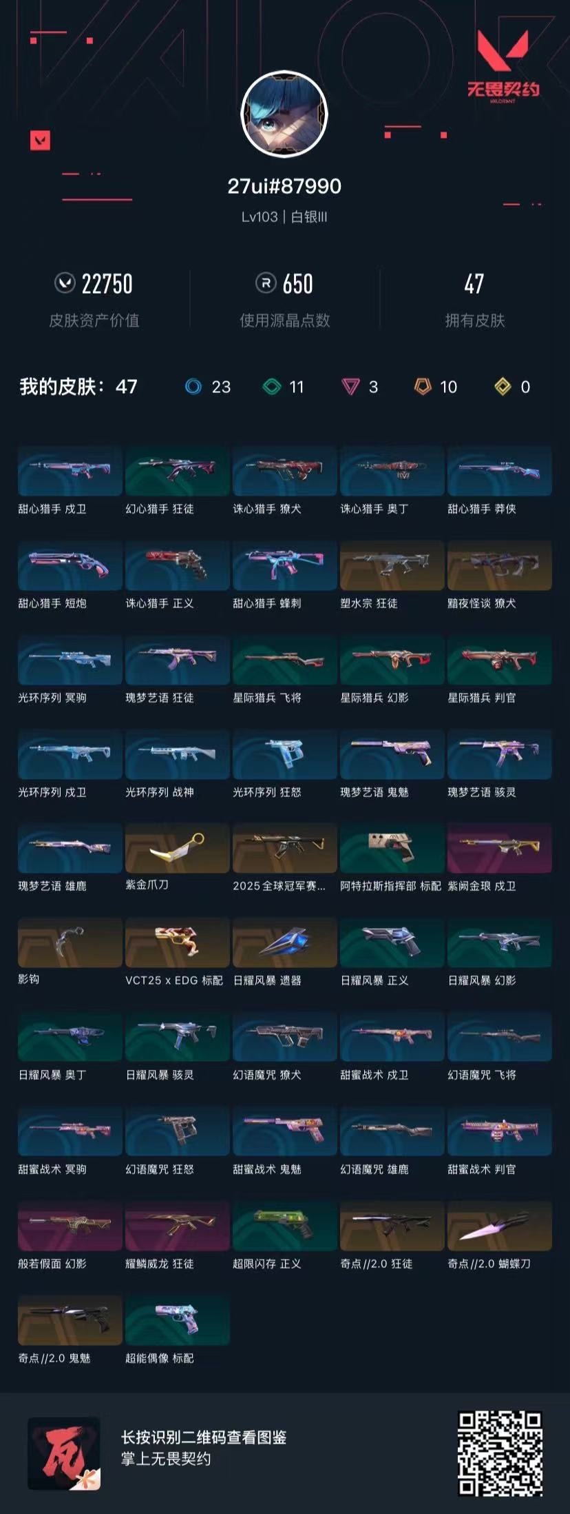 [14463708]10橙皮 3紫皮 47皮肤 27英雄 83卡面 650已用源晶 白银段位 【套装】:奇点//2.0套装 【近战武器皮肤】:蝴蝶刀-奇点//2.0影钩紫金爪刀 【佩呛皮肤】:鬼魅-奇点//2.0标配-vct25xedg 【步呛皮肤】:獠犬-黯夜怪谈狂徒-奇点//2.02025全球冠军赛 狂徒狂徒-塑水宗狂徒-耀鳞威龙幻影-般若假面戍卫-紫阙金琅 【挂饰】:薰衣草之心挂饰袖珍捷风挂饰双城之战小蛋糕挂饰神中神挂饰奇点2.0挂饰糖葫芦挂饰vctxedg挂饰终章ko小金人挂饰