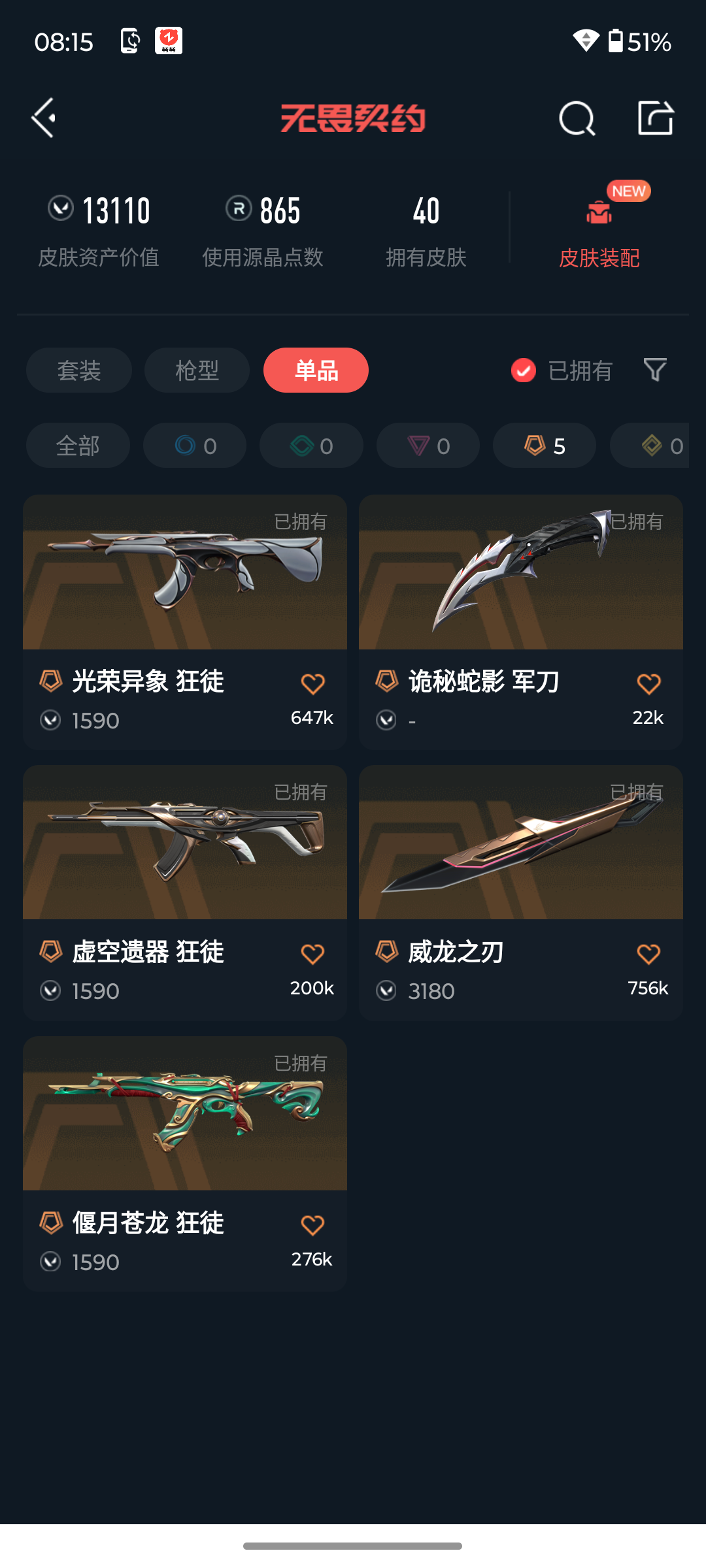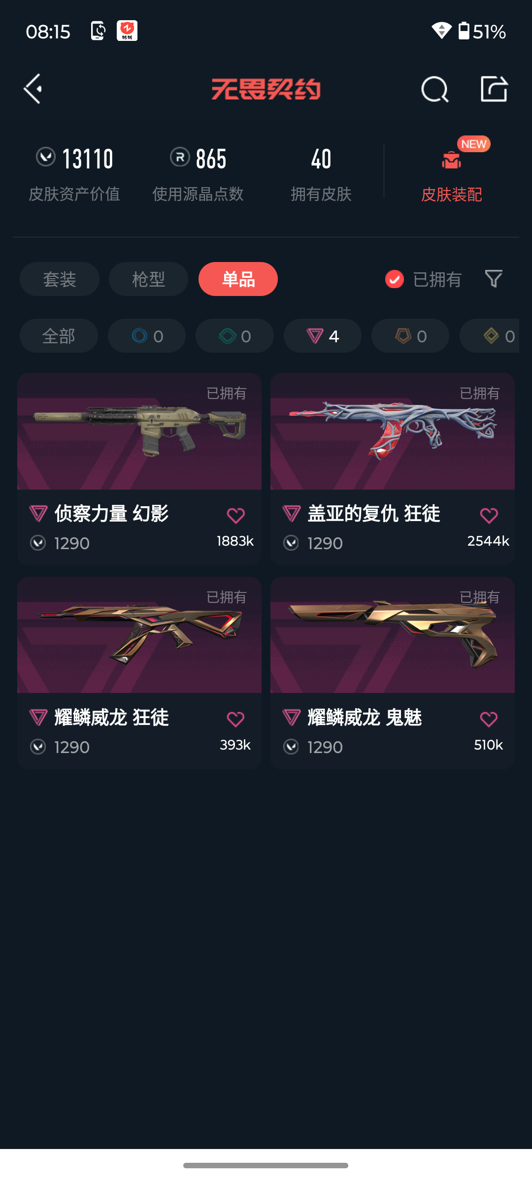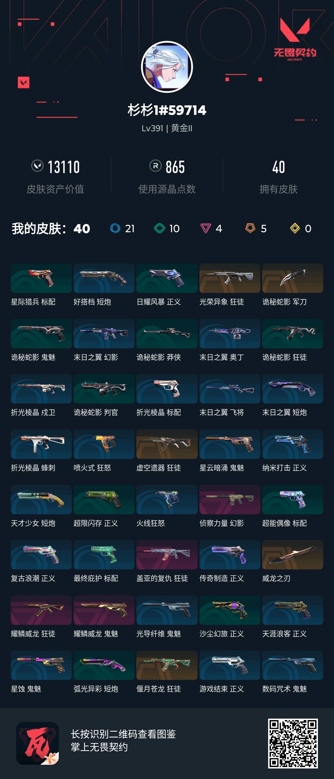 [14464264]q192364 (耀鳞威龙套装)无畏契约/等级391/段位黄金/英雄28/皮肤40/资产13110/已使用r点865/剩余r点305/耀鳞威龙-狂徒耀鳞威龙-鬼魅威龙之刃,诡秘蛇影-军刀,光荣异象-狂徒,虚空遗器-狂徒,偃月苍龙-狂徒,盖亚的复仇-狂徒,侦察力量-幻影