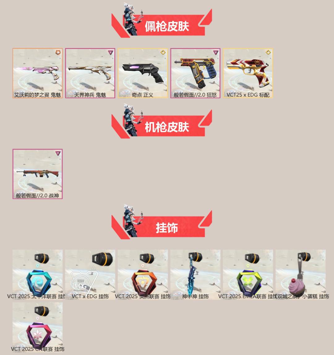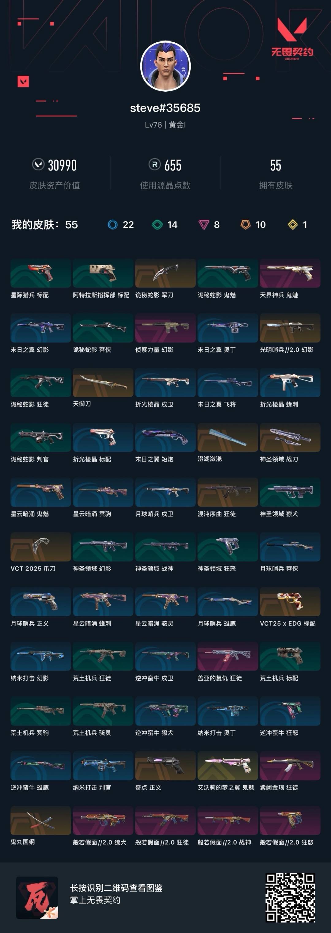 10橙皮 1金皮 8紫皮 55皮肤 15英雄 85卡面 655已用源晶 黄金段位 【套装】:般若假面//2.0套装vct 2025赛季礼包vcn2025套装 【近战武器皮肤】:神圣领域 战刀vct 2025 爪刀诡秘蛇影鬼丸国纲天御刀澄湖潋滟 【佩呛皮肤】:狂怒-般若假面//2.