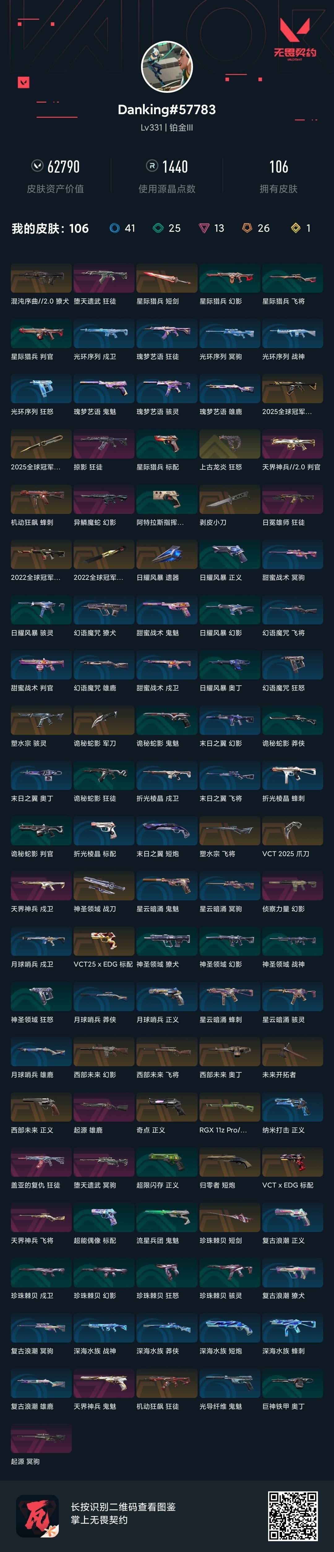 26橙皮 1金皮 13紫皮 106皮肤 28英雄 187卡面 1440已用源晶 铂金段位 【亮点皮肤】:幻影-2022全球冠军赛蝴蝶刀-2022全球冠军赛 【套装】:2025全球冠军赛2022全球冠军赛vct 2025赛季礼包西部未来vcn2025套装 【近战武器皮肤】:神圣领域 战