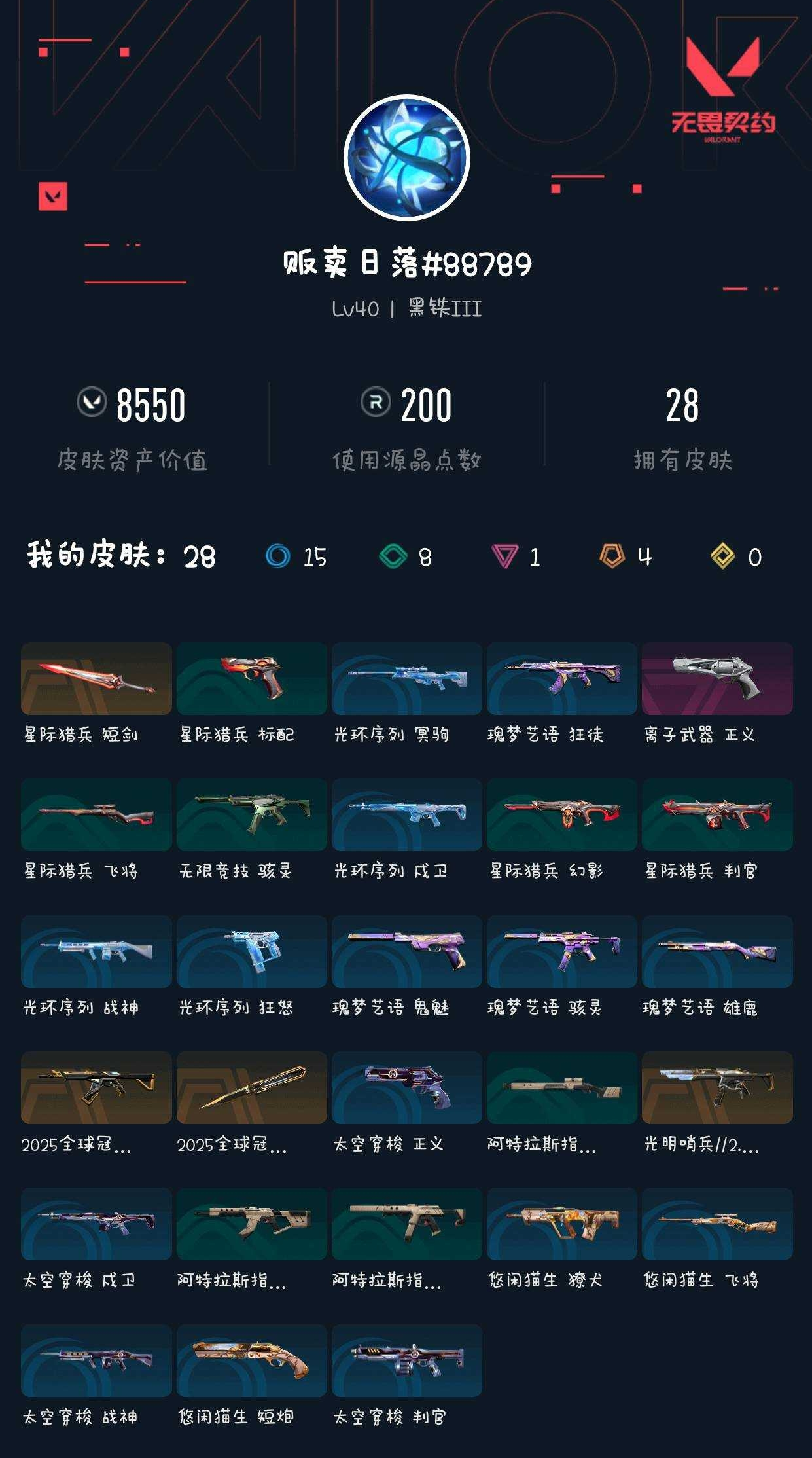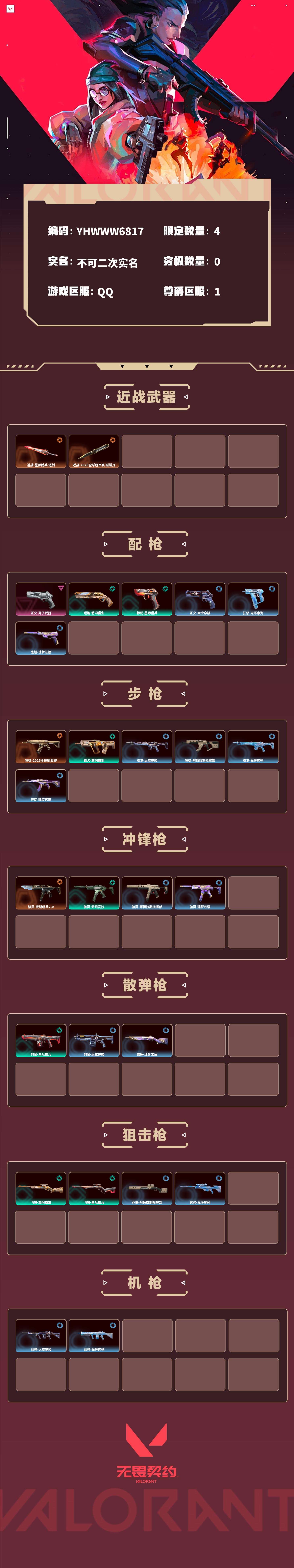 【无畏契约】【yhwww6817】等级:40,已用无畏点8550,已用源晶点200,橙皮:骇灵-光明哨兵2.0|近战-星际猎兵 短剑|狂徒-2025全球冠军赛|近战-2025全球冠军赛 蝴蝶刀__紫皮:正义-离子武器__段位:黑铁__绿皮:骇灵-无限竞技|短炮-悠闲猫生|飞将-悠闲猫生|獠犬-悠闲猫生|判官-星际猎兵|飞将-星际猎兵|标配-星际猎兵__蓝皮:正义-太空穿梭|战神-太空穿梭|判官-太空穿梭|戍卫-太空穿梭|骇灵-阿特拉斯指挥部|莽侠-阿特拉斯指挥部|狂徒-阿特拉斯指挥部|狂怒-光环序列|戍卫-光环序列|冥驹-光环序列|战神-光环序列|狂徒-瑰梦艺语|鬼魅-瑰梦艺语|骇灵-瑰梦艺语|雄鹿-瑰梦艺语__英雄:尚勃勒|黑梦|暮蝶|霓虹|壹决|k/o|幽影|海神|炼狱|贤者|猎枭|零|捷风|蝰蛇|不死鸟|幻棱|禁灭