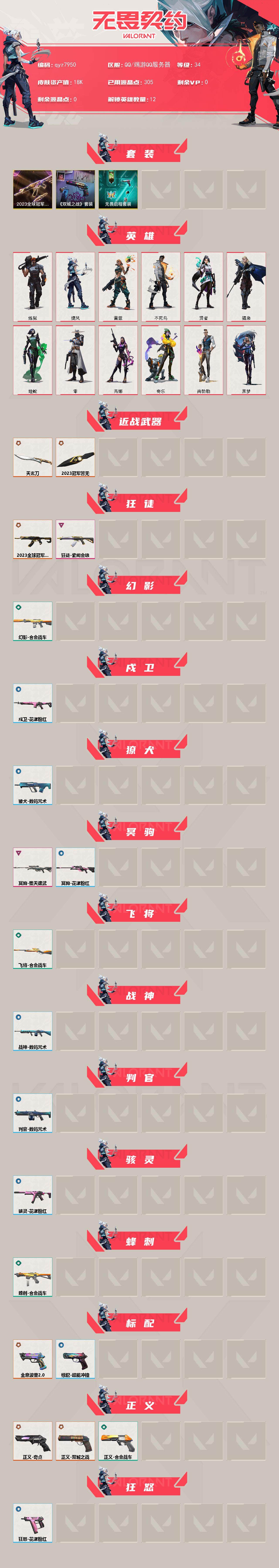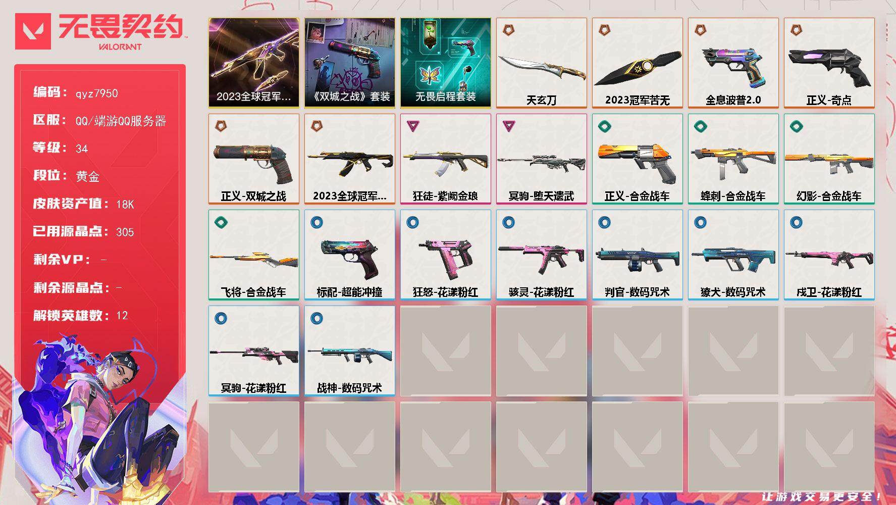 23套装-爆爆正义-天玄刀-莲花扇-qyz7950-亮点皮肤:-正义-双城之战狂徒-2023全球冠军赛苦无-2023全球冠军赛-套装:-2023全球冠军赛套装《双城之战》收藏套装-近战武器皮肤:-天玄刀-步呛皮肤:-狂徒-紫阙金琅-佩呛皮肤:-正义-奇点标配-全息波普//20-狙击呛皮肤:-冥驹-堕天遗武-亮点:-【qyz7950】【套装】:2023全球冠军赛套装,《英雄联盟:双城之战》套装,无畏启程套装【英雄】:炼狱,捷风,雷兹,不死鸟,贤者,猎枭,蝰蛇,零,芮娜,奇乐,尚勃勒,黑梦【近战-武器】:近战武器-2023全球冠军赛-苦无,近战武器-天玄刀【狂徒】:狂徒-2023全球冠军赛,狂徒-紫阙金琅【幻影】:幻影-合金战车【戍卫】:戍卫-花漾粉红【獠犬】:獠犬-数码咒术【冥驹】:冥驹-堕天遗武,冥驹-花漾粉红【飞将】:飞将-合金战车【战神】:战神-数码咒术【判官】:判官-数码咒术【骇灵】:骇灵-花漾粉红【蜂刺】:蜂刺-合金战车【标配】:标配-全息波普//20,标配-超能冲撞【正义】:正义-奇点,正义-双城之战,正义-合金战车【狂怒】:狂怒-花漾粉红【卡面】:正义的化身-卡面,无畏契约go!第一卷:零-卡面,别冒尖-卡面,代号红色-卡面,冰淇淋店-卡面,新兵报到-卡面,友军火力-卡面,v契约-卡面,无畏契约-卡面,《双城之战》谜团-卡面,2023洛杉矶全球冠军赛-卡面【喷漆】:买装还是存钱-喷漆,红鳞-喷漆,胜利属于无畏契约-喷漆,glhf-喷漆,无畏契约-喷漆【挂饰】:无畏契约-纪念币-挂饰