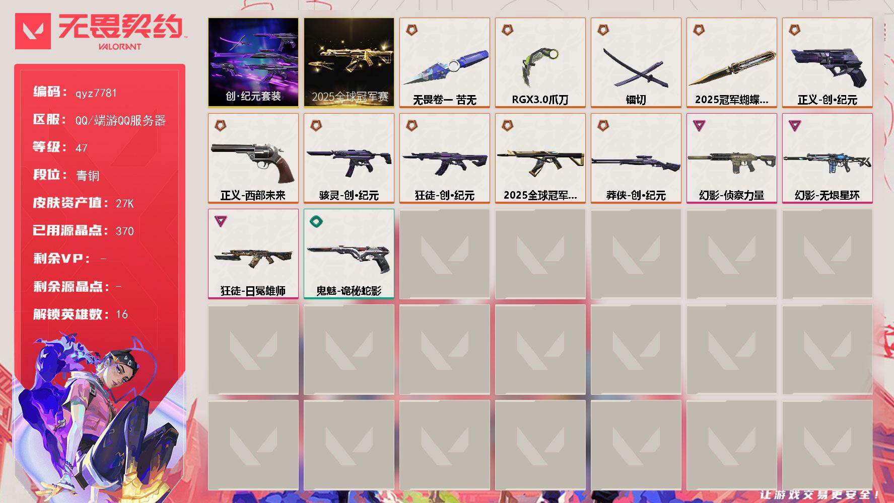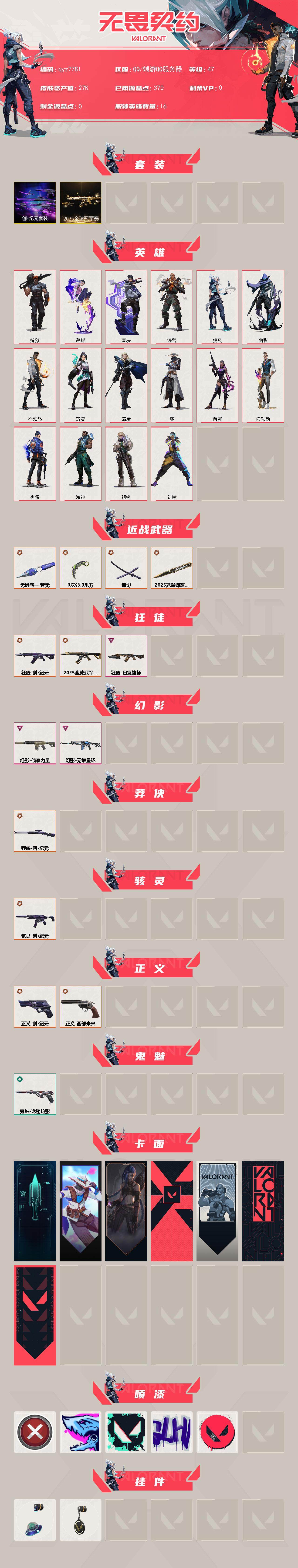 25冠军套-创纪元套-qyz7781-套装:-创纪元套装-近战武器皮肤:-苦无-无畏契约go!第一卷爪刀-rgx-11z-pro-30镭切-步呛皮肤:-幻影-无垠星环幻影-侦察力量狂徒-日冕雄师狂徒-创纪元-佩呛皮肤:-正义-创纪元正义-西部未来-狙击呛皮肤:-莽侠-创纪元-冲锋呛皮肤:-骇灵-创纪元-亮点:-【qyz7781】【套装】:2025全球冠军赛套装,创纪元套装【英雄】:幻棱,炼狱,暮蝶,壹决,铁臂,捷风,幽影,不死鸟,贤者,猎枭,零,芮娜,尚勃勒,夜露,海神,钢锁【近战-武器】:近战武器-2025全球冠军赛-蝴蝶刀,近战武器-无畏契约go!第一卷-苦无,近战武器-rgx-11z-pro//30-爪刀,近战武器-镭切【狂徒】:狂徒-2025全球冠军赛,狂徒-创纪元,狂徒-日冕雄师【幻影】:幻影-无垠星环,幻影-侦察力量【莽侠】:莽侠-创纪元【骇灵】:骇灵-创纪元【正义】:正义-创纪元,正义-西部未来【鬼魅】:鬼魅-诡秘蛇影【卡面】:零点嗅探设计图-卡面,无畏契约go!第一卷:零-卡面,《双城之战》金克丝-卡面,代号红色-卡面,新兵报到-卡面,v契约-卡面,无畏契约-卡面【喷漆】:买装还是存钱-喷漆,暴走萝莉-喷漆,胜利属于无畏契约-喷漆,glhf-喷漆,无畏契约-喷漆【挂饰】:天外飞客-挂饰,无畏契约-纪念币-挂饰