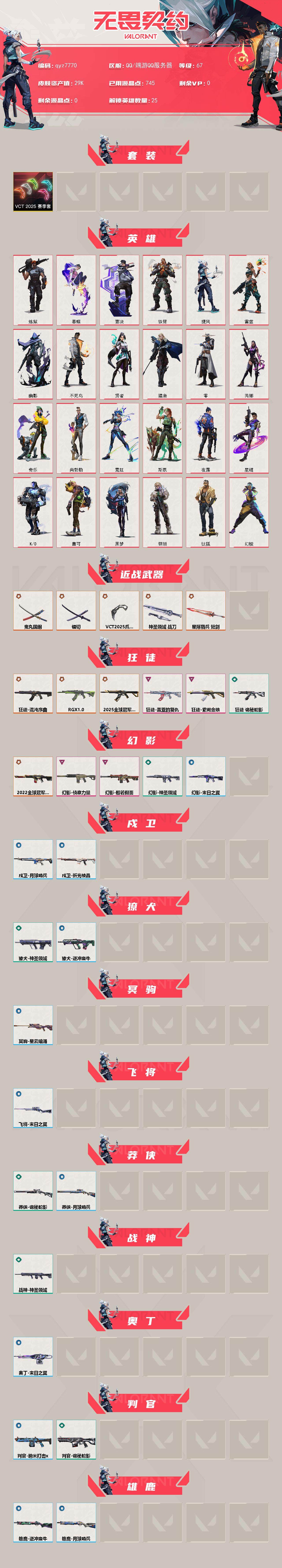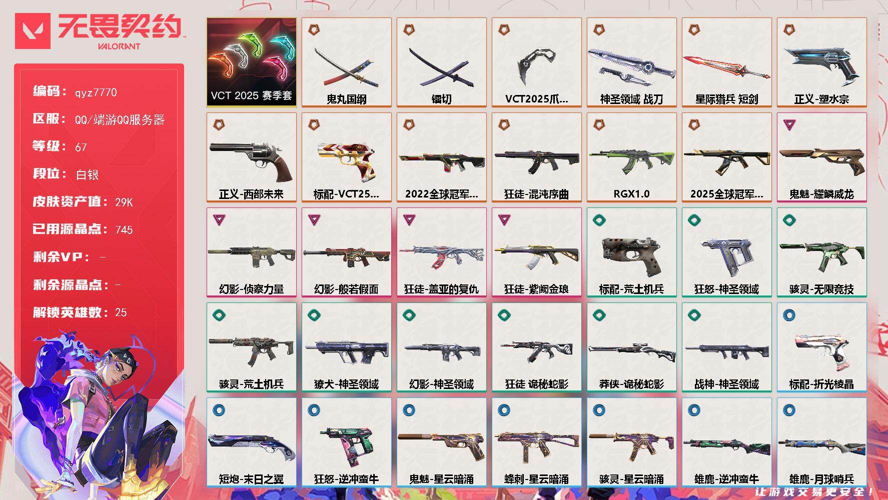 镭切-25爪-22m4-鬼丸国纲-25-显卡-盖亚-混沌-紫金ak-qyz7770-亮点皮肤:-幻影-2022全球冠军赛-套装:-vct-2025赛季礼包-近战武器皮肤:-鬼丸国纲镭切神圣领域-战刀vct-2025-爪刀-步呛皮肤:-狂徒-紫阙金琅狂徒-盖亚的复仇幻影-侦察力量幻影-般若假面狂徒-混沌序曲狂徒-rgx-11z-pro2025全球冠军赛-狂徒-佩呛皮肤:-正义-塑水宗鬼魅-耀鳞威龙标配-vct25xedg正义-西部未来-亮点:-【qyz7770】【套装】:vct-2025-赛季套装【英雄】:幻棱,炼狱,暮蝶,钛狐,壹决,铁臂,捷风,雷兹,幽影,不死鸟,贤者,猎枭,零,芮娜,奇乐,尚勃勒,霓虹,斯凯,夜露,星礈,k/o,盖可,黑梦,钢锁【近战-武器】:近战武器-vct-2025-爪刀,近战武器-镭切,近战武器-鬼丸国纲,近战武器-神圣领域-战刀,近战武器-星际猎兵-短剑【狂徒】:狂徒-2025全球冠军赛,狂徒-混沌序曲,狂徒-rgx-11z-pro,狂徒-盖亚的复仇,狂徒-紫阙金琅,狂徒-诡秘蛇影【幻影】:幻影-2022全球冠军赛,幻影-般若假面,幻影-侦察力量,幻影-神圣领域,幻影-末日之翼【戍卫】:戍卫-月球哨兵,戍卫-折光棱晶【獠犬】:獠犬-神圣领域,獠犬-逆冲蛮牛【冥驹】:冥驹-星云暗涌【飞将】:飞将-末日之翼【莽侠】:莽侠-诡秘蛇影,莽侠-月球哨兵【战神】:战神-神圣领域【奥丁】:奥丁-末日之翼【判官】:判官-诡秘蛇影,判官-纳米打击x【雄鹿】:雄鹿-逆冲蛮牛,雄鹿-月球哨兵【骇灵】:骇灵-荒土机兵,骇灵-无限竞技,骇灵-星云暗涌【蜂刺】:蜂刺-星云暗涌,蜂刺-折光棱晶【标配】:标配-荒土机兵,标配-折光棱晶【vct手呛】:标配-vct25-x-edg【正义】:正义-塑水宗,正义-西部未来,正义-月球哨兵【鬼魅】:鬼魅-耀鳞威龙,鬼魅-星云暗涌【狂怒】:狂怒-神圣领域,狂怒-逆冲蛮牛【短炮】:短炮-末日之翼【卡面】:纳米打击-卡面,抑制技术-卡面,瓦娃脸雪糕-p2-卡面,荒土机兵-卡面,南瓜盛典-卡面,无畏契约go!第一卷:芮娜-卡面,无畏契约go!第一卷:零-卡面,沙尘幻旅-卡面,代号红色-卡面,新兵报到-卡面,v契约-卡面,无畏契约-卡面【喷漆】:请求重启-喷漆,纳米打击-喷漆,独守蝰腹-喷漆,通