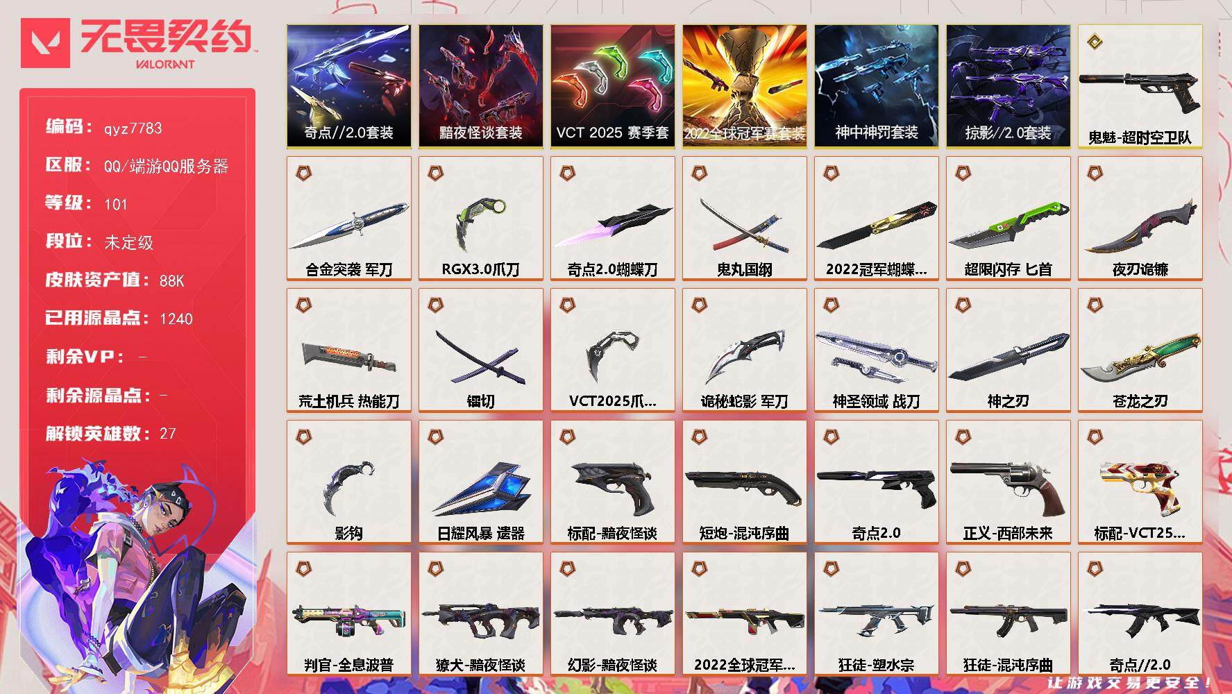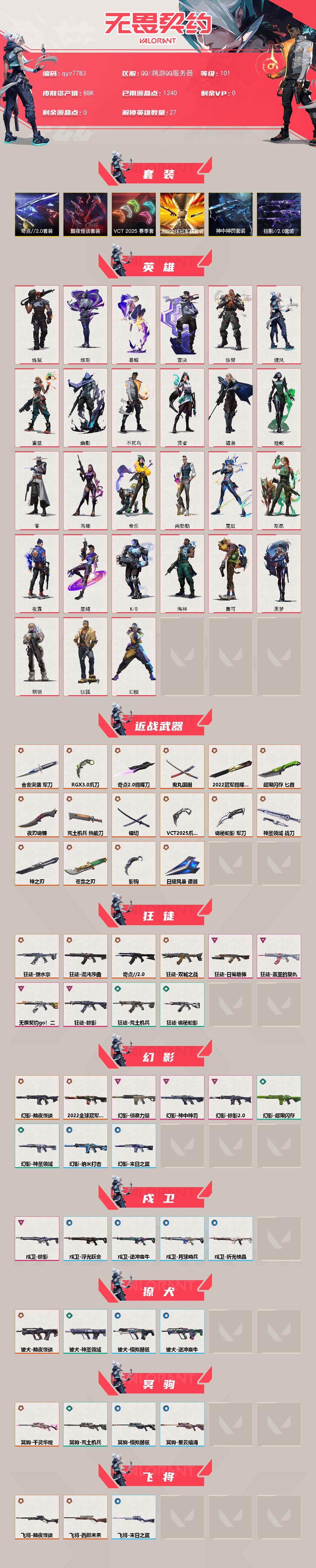 22套装-显卡爪-25爪-奇点蝴蝶-qyz7783-亮点皮肤:-幻影-2022全球冠军赛蝴蝶刀-2022全球冠军赛-套装:-黯夜怪谈套装奇点//20套装vct-2025赛季礼包神中神罚套装2022全球冠军赛掠影20套装-近战武器皮肤:-军刀-合金突袭爪刀-rgx-11z-pro-30夜刃诡镰匕首-超限闪存蝴蝶刀-奇点//20荒土机兵热能刀鬼丸国纲镭切神圣领域-战刀vct-2025-爪刀诡秘蛇影神之刃苍龙之刃影钩-步呛皮肤:-狂徒-盖亚的复仇幻影-侦察力量狂徒-塑水宗狂徒-无畏契约go!第二卷狂徒-日冕雄师狂徒-混沌序曲獠犬-黯夜怪谈幻影-黯夜怪谈狂徒-奇点//20狂徒-掠影戍卫-掠影狂徒-双城之战幻影-神中神罚幻影-掠影20-佩呛皮肤:-鬼魅-天界神兵正义-离子武器短炮-混沌序曲标配-黯夜怪谈鬼魅-奇点//20标配-vct25xedg正义-西部未来狂怒-神中神罚鬼魅-超时空卫队鬼魅-掠影20-狙击呛皮肤:-冥驹-千灵华绽飞将-黯夜怪谈飞将-西部未来莽侠-神中神罚-冲锋呛皮肤:-骇灵-神中神罚骇灵-掠影20-霰弹呛皮肤:-雄鹿-起源判官-全息波普-机呛皮肤:-战神-奇点奥丁-西部未来奥丁-掠影20-亮点:-【qyz7783】【套装】:2022全球冠军赛套装,vct-2025-赛季套装,奇点//20套装,黯夜怪谈套装,神中神罚套装,掠影//20套装【英雄】:幻棱,炼狱,维斯,暮蝶,钛狐,壹决,铁臂,捷风,雷兹,幽影,不死鸟,贤者,猎枭,蝰蛇,零,芮娜,奇乐,尚勃勒,霓虹,斯凯,夜露,星礈,k/o,海神,盖可,黑梦,钢锁【近战-武器】:近战武器-2022全球冠军赛-蝴蝶刀,近战武器-影钩,近战武器-5周年//公测重制版-苍龙之刃,近战武器-神之刃,近战武器-奇点//20-蝴蝶刀,近战武器-vct-2025-爪刀,近战武器-rgx-11z-pro//30-爪刀,近战武器-镭切,近战武器-鬼丸国纲,近战武器-超限闪存-匕首,近战武器-合金突袭-军刀,近战武器-荒土机兵-热能刀,近战武器-夜刃诡镰,近战武器-诡秘蛇影-军刀,近战武器-神圣领域-战刀,近战武器-日耀风暴-遗器【狂徒】:狂徒-混沌序曲,狂徒-奇点//20,狂徒-双城之战