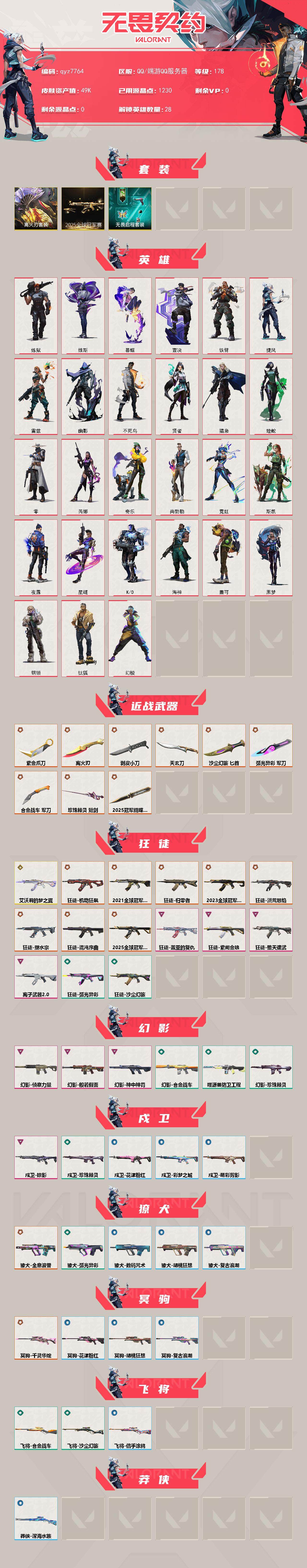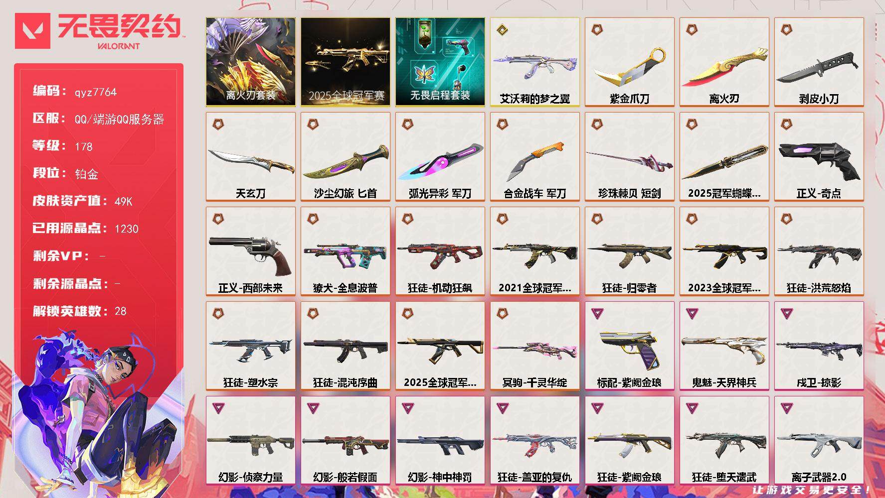 离火/21/23/25剩下也都是热门皮-qyz7764-亮点皮肤:-离火刃狂徒-2023全球冠军赛狂徒-2021全球冠军赛-近战武器皮肤:-军刀-合金战车军刀-弧光异彩天玄刀匕首-沙尘幻旅剥皮小刀紫金爪刀短剑-珍珠棘贝2025全球冠军赛-蝴蝶刀-步呛皮肤:-狂徒-紫阙金琅狂徒-盖亚的复仇幻影-侦察力量狂徒-归零者狂徒-机动狂飙獠犬-全息波普狂徒-塑水宗狂徒-堕天遗武狂徒-洪荒怒焰幻影-般若假面狂徒-艾沃莉的梦之翼狂徒-混沌序曲戍卫-掠影狂徒-离子武器20幻影-神中神罚2025全球冠军赛-狂徒-佩呛皮肤:-标配-紫阙金琅正义-奇点鬼魅-天界神兵正义-西部未来-狙击呛皮肤:-冥驹-千灵华绽-亮点:-【qyz7764】【套装】:离火刃套装,2025全球冠军赛套装,离火刃套装,无畏启程套装【英雄】:幻棱,炼狱,维斯,暮蝶,钛狐,壹决,铁臂,捷风,雷兹,幽影,不死鸟,贤者,猎枭,蝰蛇,零,芮娜,奇乐,尚勃勒,霓虹,斯凯,夜露,星礈,k/o,海神,盖可,黑梦,钢锁【近战-武器】:近战武器-2025全球冠军赛-蝴蝶刀,近战武器-剥皮小刀,近战武器-紫金爪刀,近战武器-离火刃,近战武器-珍珠棘贝-短剑,近战武器-合金战车-军刀,近战武器-弧光异彩-军刀,近战武器-沙尘幻旅-匕首,近战武器-天玄刀【狂徒】:狂徒-艾沃莉的梦之翼,狂徒-2025全球冠军赛,狂徒-2023全球冠军赛,狂徒-2021全球冠军赛,狂徒-归零者,狂徒-洪荒怒焰,狂徒-混沌序曲,狂徒-机动狂飙,狂徒-塑水宗,狂徒-堕天遗武,狂徒-盖亚的复仇,狂徒-紫阙金琅,狂徒-离子武器//20,狂徒-弧光异彩,狂徒-沙尘幻旅【幻影】:幻影-般若假面,幻影-侦察力量,幻影-神中神罚,幻影-合金战车,幻影-噬源兽防卫工程,幻影-珍珠棘贝【戍卫】:戍卫-掠影,戍卫-珍珠棘贝,戍卫-彩梦之城,戍卫-花漾粉红,戍卫-萌彩剪影【獠犬】:獠犬-全息波普,獠犬-弧光异彩,獠犬-复古浪潮,獠犬-胡桃狂想,獠犬-数码咒术【冥驹】:冥驹-千灵华绽,冥驹-复古浪潮,冥驹-胡桃狂想,冥驹-花漾粉红【飞将】:飞将-合金战车,飞将-沙尘幻旅,飞将-信手涂鸦【莽侠】:莽侠-深海水族【战神】:战神-萌彩剪影,战神-深海水族,战神-数码咒术【奥丁】:奥丁-信手涂鸦【判官】:判官-萌彩剪