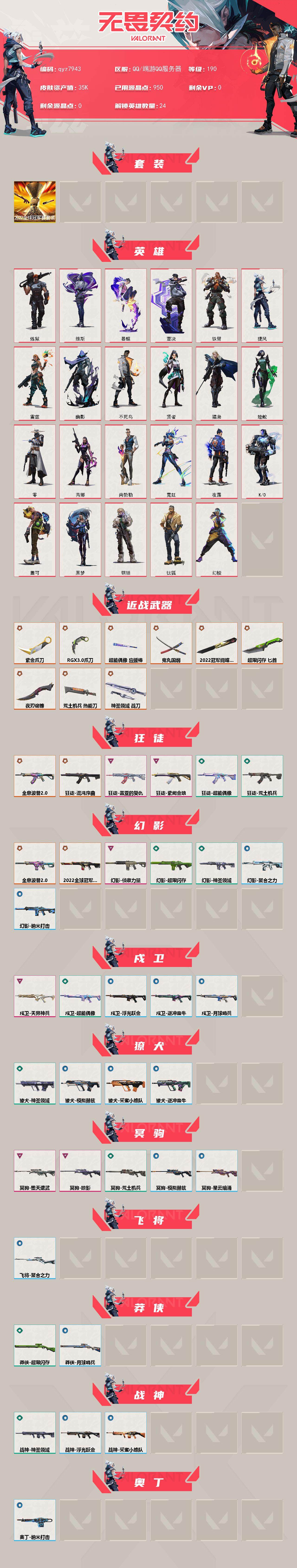 黄金极品号-qyz7943-亮点皮肤:-幻影-2022全球冠军赛蝴蝶刀-2022全球冠军赛-套装:-2022全球冠军赛-近战武器皮肤:-紫金爪刀超能偶像-应援棒爪刀-rgx-11z-pro-30夜刃诡镰匕首-超限闪存荒土机兵热能刀鬼丸国纲神圣领域-战刀-步呛皮肤:-狂徒-紫阙金琅狂徒-盖亚的复仇幻影-侦察力量戍卫-天界神兵幻影-全息波普//20狂徒-全息波普//20狂徒-混沌序曲-佩呛皮肤:-正义-奇点鬼魅-天界神兵标配-vct25xblg-狙击呛皮肤:-冥驹-堕天遗武冥驹-掠影-亮点:-【qyz7943】【套装】:2022全球冠军赛套装【英雄】:幻棱,炼狱,维斯,暮蝶,钛狐,壹决,铁臂,捷风,雷兹,幽影,不死鸟,贤者,猎枭,蝰蛇,零,芮娜,尚勃勒,霓虹,夜露,k/o,盖可,黑梦,钢锁【近战-武器】:近战武器-2022全球冠军赛-蝴蝶刀,近战武器-紫金爪刀,近战武器-rgx-11z-pro//30-爪刀,近战武器-鬼丸国纲,近战武器-超能偶像-应援棒,近战武器-超限闪存-匕首,近战武器-荒土机兵-热能刀,近战武器-夜刃诡镰,近战武器-神圣领域-战刀【狂徒】:狂徒-混沌序曲,狂徒-全息波普//20,狂徒-盖亚的复仇,狂徒-紫阙金琅,狂徒-超能偶像,狂徒-荒土机兵【幻影】:幻影-2022全球冠军赛,幻影-全息波普//20,幻影-侦察力量,幻影-超限闪存,幻影-神圣领域,幻影-聚合之力,幻影-纳米打击【戍卫】:戍卫-天界神兵,戍卫-超能偶像,戍卫-浮光跃金,戍卫-逆冲蛮牛,戍卫-月球哨兵【獠犬】:獠犬-神圣领域,獠犬-采蜜小蜂队,獠犬-模拟赫兹,獠犬-逆冲蛮牛【冥驹】:冥驹-堕天遗武,冥驹-掠影,冥驹-荒土机兵,冥驹-模拟赫兹,冥驹-星云暗涌【飞将】:飞将-聚合之力【莽侠】:莽侠-超限闪存,莽侠-月球哨兵【战神】:战神-神圣领域,战神-采蜜小蜂队,战神-浮光跃金【奥丁】:奥丁-纳米打击【判官】:判官-超能偶像,判官-采蜜小蜂队,判官-纳米打击x【雄鹿】:雄鹿-模拟赫兹,雄鹿-逆冲蛮牛,雄鹿-月球哨兵【骇灵】:骇灵-荒土机兵,骇灵-浮光跃金,骇灵-星云暗涌【蜂刺】:蜂刺-超限闪存,蜂刺-聚合之力,蜂刺-星云暗涌【标配】:标配-超能偶像,标配-荒土机兵,标配-浮光跃金【vct手呛】:标配-vct25-x-blg【正义】:正义-奇点,正义-超限闪