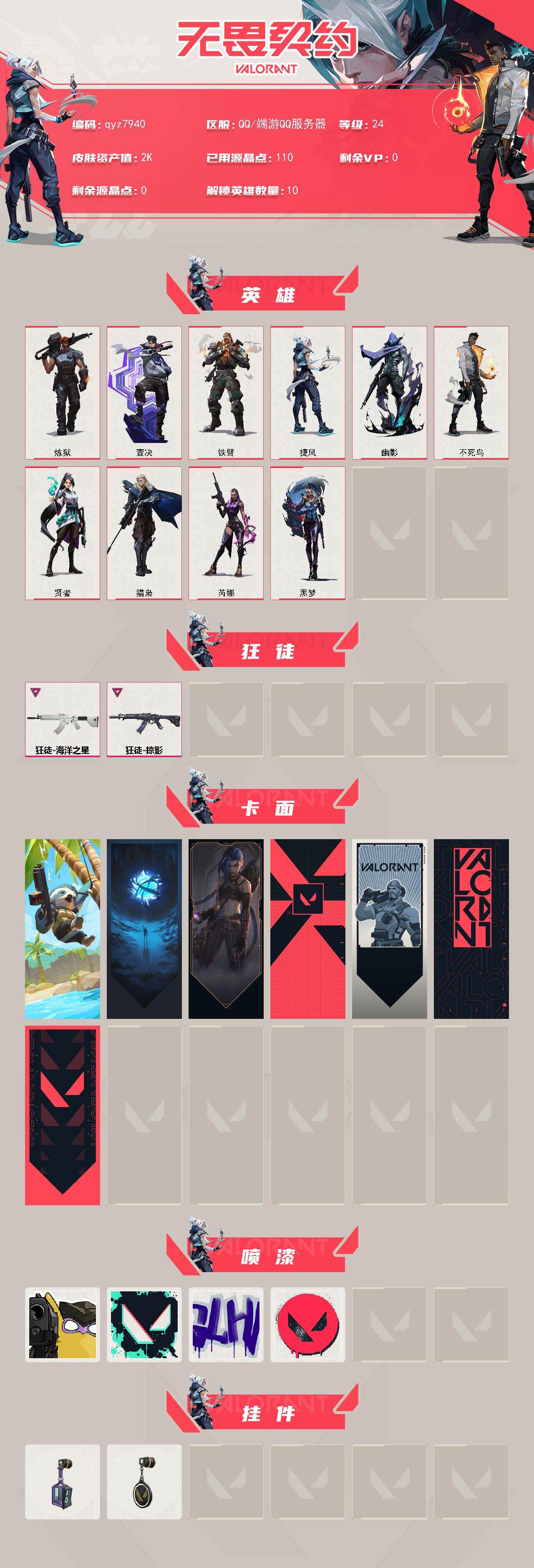 俩ak小号-qyz7940-步呛皮肤:-狂徒-海洋之星狂徒-掠影-亮点:-【qyz7940】【英雄】:炼狱,壹决,铁臂,捷风,幽影,不死鸟,贤者,猎枭,芮娜,黑梦【狂徒】:狂徒-掠影,狂徒-海洋之星【卡面】:树懒大作战-卡面,无垠星环-卡面,《双城之战》金克丝-卡面,代号红色-卡面,新兵报到-卡面,v契约-卡面,无畏契约-卡面【喷漆】:放下武器-喷漆,胜利属于无畏契约-喷漆,glhf-喷漆,无畏契约-喷漆【挂饰】:动力机箱-挂饰,无畏契约-纪念币-挂饰