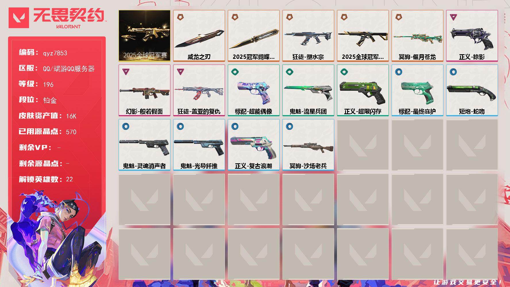 25套装-威龙小刀-盖亚塑水ak-般若m4-qyz7853-近战武器皮肤:-威龙之刃-步呛皮肤:-狂徒-盖亚的复仇狂徒-塑水宗幻影-般若假面-佩呛皮肤:-正义-掠影-狙击呛皮肤:-冥驹-偃月苍龙-亮点:-【qyz7853】【套装】:2025全球冠军赛套装【英雄】:炼狱,维斯,暮蝶,壹决,铁臂,捷风,雷兹,幽影,不死鸟,贤者,猎枭,蝰蛇,零,芮娜,奇乐,尚勃勒,霓虹,斯凯,夜露,星礈,盖可【近战-武器】:近战武器-2025全球冠军赛-蝴蝶刀,近战武器-威龙之刃【狂徒】:狂徒-2025全球冠军赛,狂徒-塑水宗,狂徒-盖亚的复仇【幻影】:幻影-般若假面【冥驹】:冥驹-偃月苍龙,冥驹-沙场老兵【标配】:标配-超能偶像,标配-最终庇护【正义】:正义-掠影,正义-超限闪存,正义-复古浪潮【鬼魅】:鬼魅-流星兵团,鬼魅-光导纤维,鬼魅-灵魂消声者【短炮】:短炮-蛇吻【卡面】:《双城之战》拥抱-卡面,精灵大战-卡面,欢迎来到底城-卡面,南瓜盛典-卡面,无畏契约:暮蝶-卡面,修车达人-卡面,正义的化身-卡面,至黑之夜-卡面,终章:生意人麦宝-卡面,铁之华-卡面,时间到-卡面,最高舞台-卡面,声感陷阱设计图-卡面,梦幻奶茶-卡面,终章:打造专属狂徒-卡面,趁热吃-卡面,源能反应-卡面,零点嗅探设计图-卡面,终章:瓦娃脸雪糕-卡面,无畏契约:蝰蛇-卡面,表象之下-卡面,沙雕爆能器-卡面,无畏契约go!第一卷:芮娜-卡面,清除名单-卡面,无畏契约go!第一卷:零-卡面,终章:同步耍酷-卡面,龍记-卡面,化茧成蝶-卡面,无垠星环-卡面,先瓦为敬-绿色-卡面,《双城之战》金克丝-卡面,完美调谐-卡面-,暗呛-卡面,"luie"-卡面,铁臂设计图-卡面,代号红色-卡面,冰淇淋店-卡面,新兵报到-卡面,友军火力-卡面,v契约-卡面,无畏契约-卡面,809特遣队-卡面【喷漆】:嘭!-喷漆,都算到了-喷漆,控场勿近-喷漆,伤心心-喷漆,小丑猫-喷漆,熊抱-喷漆,又被闪了-喷漆,超级粉丝-喷漆,捷风差距-喷漆,惊声尖叫-喷漆,拼一呛-喷漆,我觉得不行-喷漆,蝰蛇-喷漆,我的刀呢?-喷漆,致命毒素-喷漆,喜欢哪种毒?-喷漆,霓光四射-喷漆,uwu-喷漆,新潮流-喷漆,双击点赞-喷漆,买装还是存钱-喷漆,醒狮贺春-喷漆,无畏契约go!第一卷:芮娜-喷漆,红鳞-喷漆,无畏契约go!