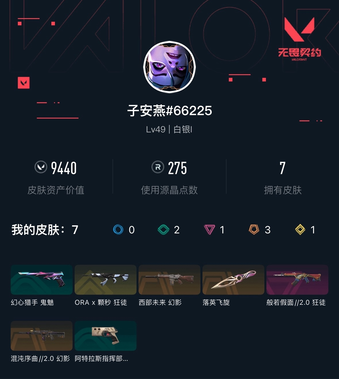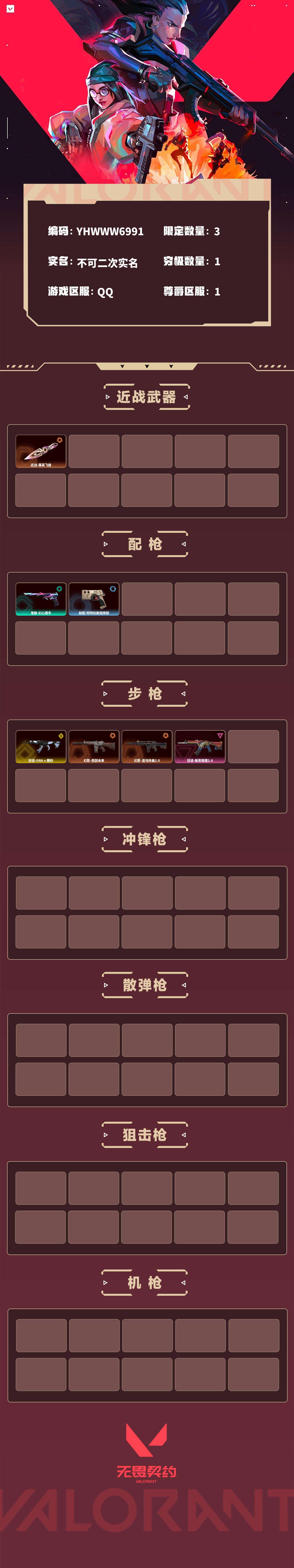 【无畏契约】【yhwww6991】等级:49,已用无畏点9440,已用源晶点275,橙皮:近战-落英飞旋|幻影-西部未来|幻影-混沌序曲2.0__段位:白银__紫皮:狂徒-般若假面2.0__蓝皮:标配-阿特拉斯指挥部__英雄:暮蝶|盖可|奇乐|炼狱|贤者|猎枭|芮娜|捷风|不死鸟|雷兹|禁灭__绿皮:鬼魅-幻心猎手__金皮:狂徒-a x 颗秒