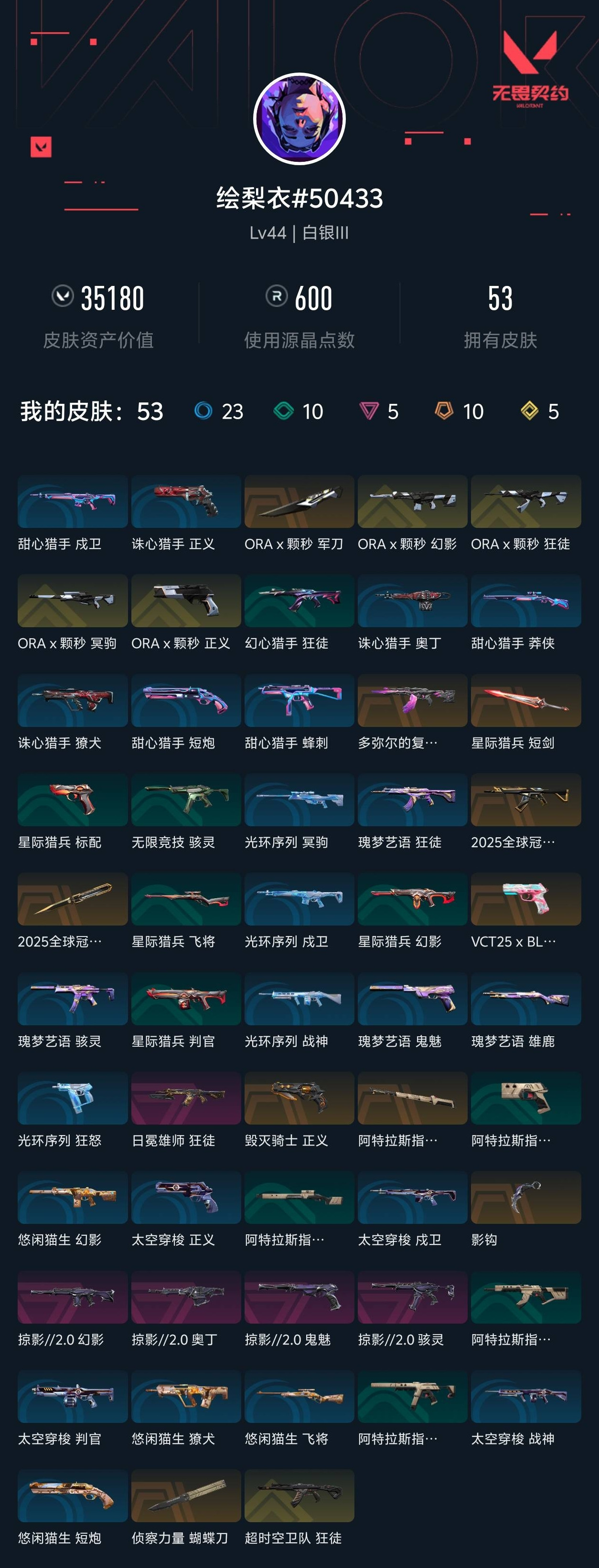 【无畏契约】【yhwww6983】等级:48,已用无畏点35180,已用源晶点630,紫皮:狂徒-日冕雄师|骇灵-掠影2.0|奥丁-掠影2.0|鬼魅-掠影2.0|幻影-掠影2.0__段位:黄金__橙皮:近战-侦察力量 蝴蝶刀|正义-毁灭骑士|标配-vct25 x blg|近战-阿特拉斯指挥部 甩棍|近战-星际猎兵 短剑|狂徒-2025全球冠军赛|近战-2025全球冠军赛 蝴蝶刀|近战-影钩|狂徒-多弥尔的复仇|近战-a x 颗秒 军刀__绿皮:骇灵-无限竞技|短炮-悠闲猫生|飞将-悠闲猫生|幻影-悠闲猫生|獠犬-悠闲猫生|判官-星际猎兵|飞将-星际猎兵|标配-星际猎兵|狂徒-幻心猎手__蓝皮:正义-太空穿梭|战神-太空穿梭|判官-太空穿梭|戍卫-太空穿梭|骇灵-阿特拉斯指挥部|莽侠-阿特拉斯指挥部|标配-阿特拉斯指挥部|狂徒-阿特拉斯指挥部|狂怒-光环序列|戍卫-光环序列|冥驹-光环序列|战神-光环序列|狂徒-瑰梦艺语|鬼魅-瑰梦艺语|骇灵-瑰梦艺语|雄鹿-瑰梦艺语|蜂刺-甜心猎手|短炮-甜心猎手|莽侠-甜心猎手|幻影-甜心猎手|戍卫-甜心猎手|正义-诛心猎手|冥驹-诛心猎手|獠犬-诛心猎手|奥丁-诛心猎手__金皮:狂徒-超时空卫队|狂徒-a x 颗秒|幻影-a x 颗秒|冥驹-a x 颗秒|正义-a x 颗秒__英雄:尚勃勒|黑梦|暮蝶|霓虹|k/o|奇乐|炼狱|铁臂|贤者|猎枭|芮娜|零|捷风|不死鸟|幻棱