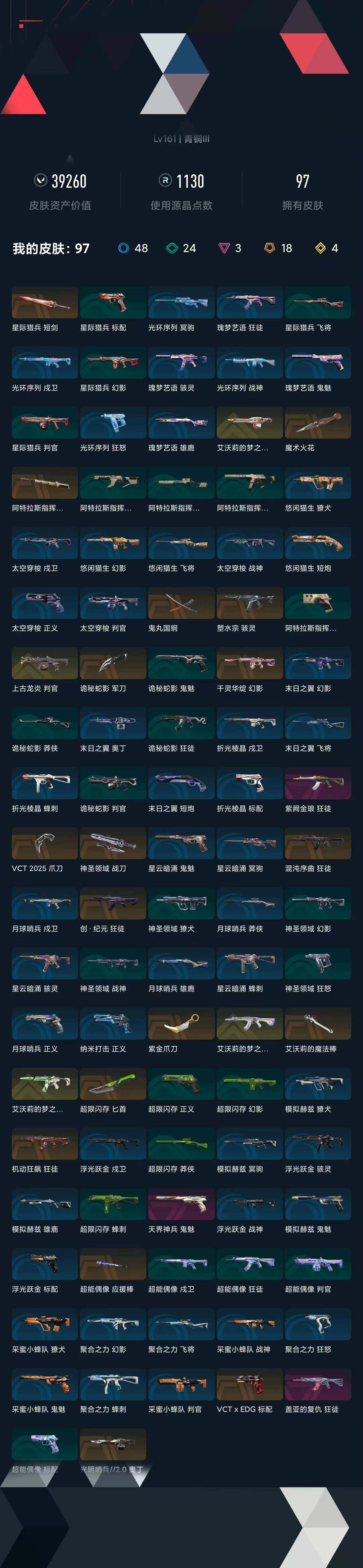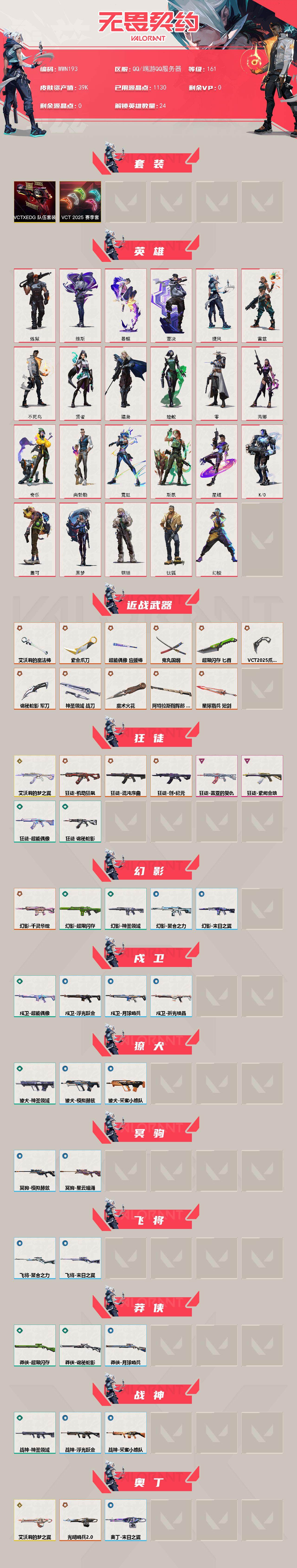 【wwn193】终极18/传奇4/卓越3/皮肤97/等级161/段位:青铜/vct 2025 赛季/vct-x-edg 套装/幻棱/炼狱/维斯/暮蝶/钛狐/壹决/捷风/雷兹/不死鸟/贤者/猎枭/蝰蛇/零/芮娜/奇乐/尚勃勒/霓虹/斯凯/星礈/k/o/盖可/黑梦/钢锁/近战武器-魔术火花/vct-2025-爪刀/紫金爪刀/艾沃莉的魔法棒/鬼丸国纲/近战武器-超能偶像 应援棒/超限闪存匕